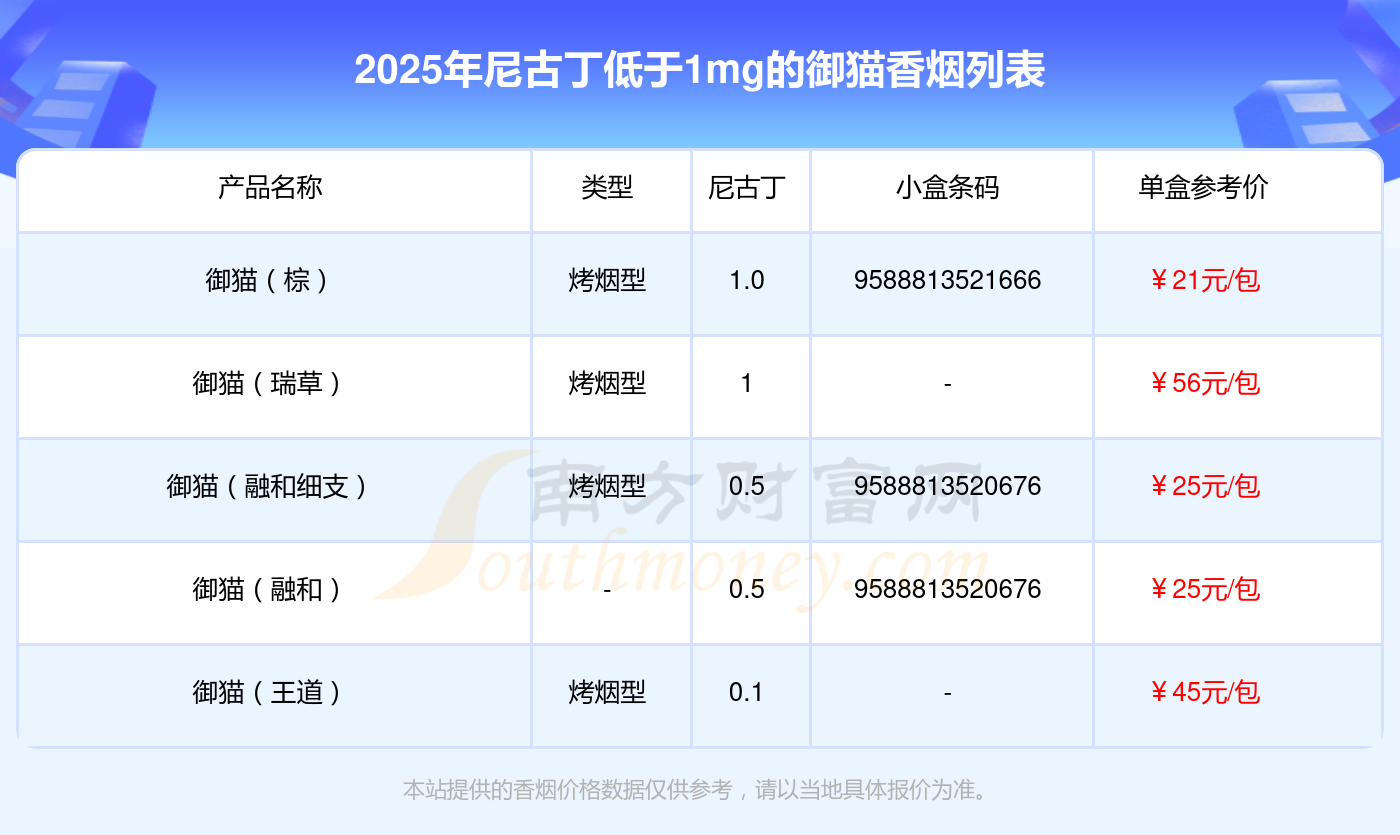 御猫香烟尼古丁低于1mg的烟分别有御猫(棕)参考价21.0元/包、御猫(瑞草)参考价56元/包、御猫(融和细支)参考价25元/包、御猫(融和)参考价25元/包、御猫(王道)参考价45元/包等。
