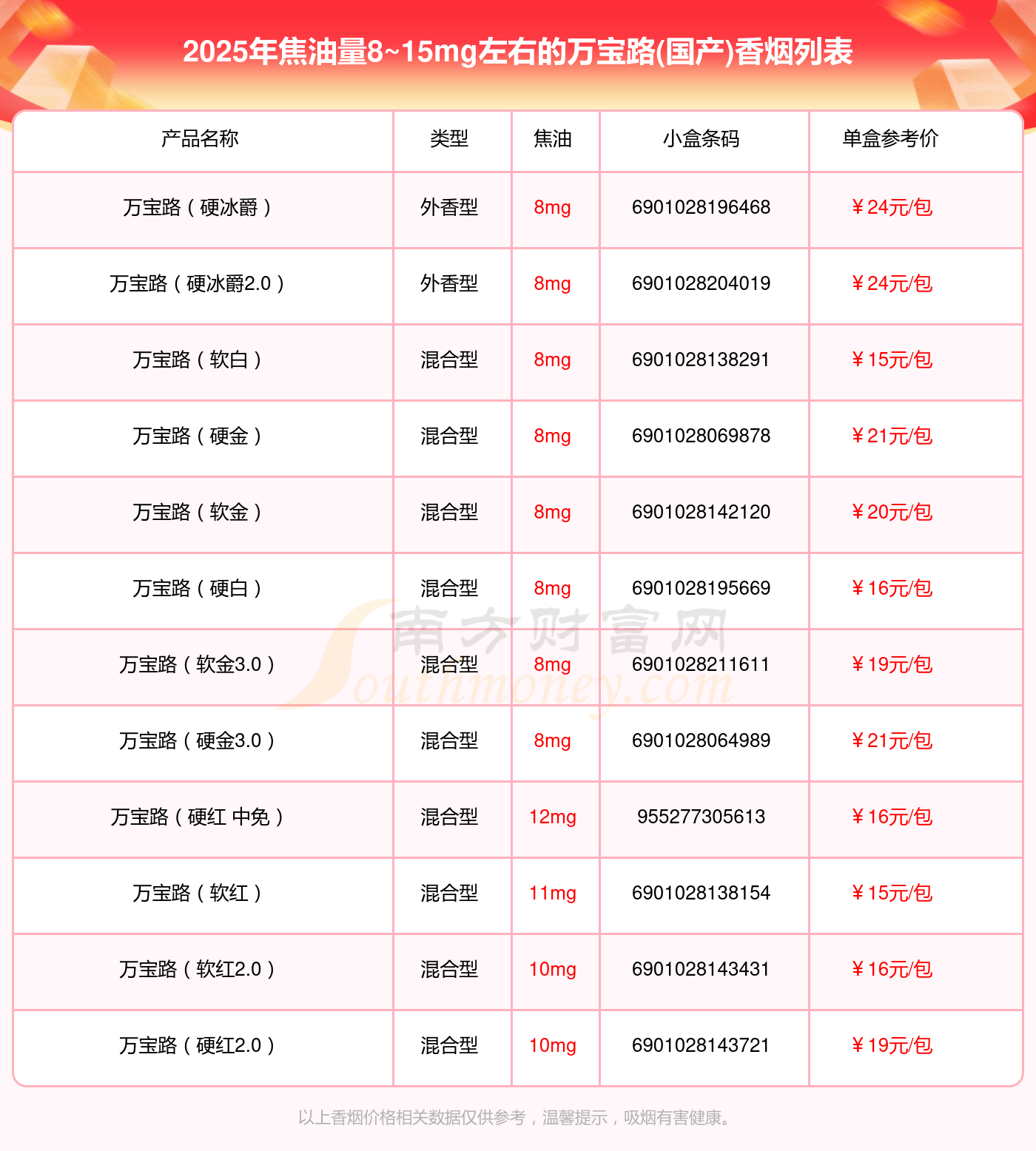 择烟网为大家盘点了焦油量8~15mg左右的万宝路(国产)香烟,有万宝路(硬冰爵)、万宝路(硬冰爵2.0)、万宝路(软白)、万宝路(硬金)、万宝路(软金)、万宝路(硬白)、万宝路(软金3.0)、万宝路(硬金3.0)、万宝路(硬红 中免)、万宝路(软红)等,详细价格如下: