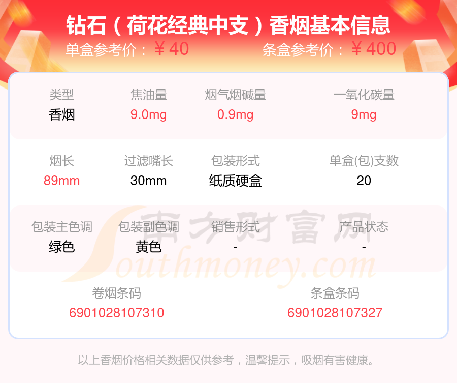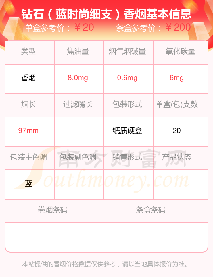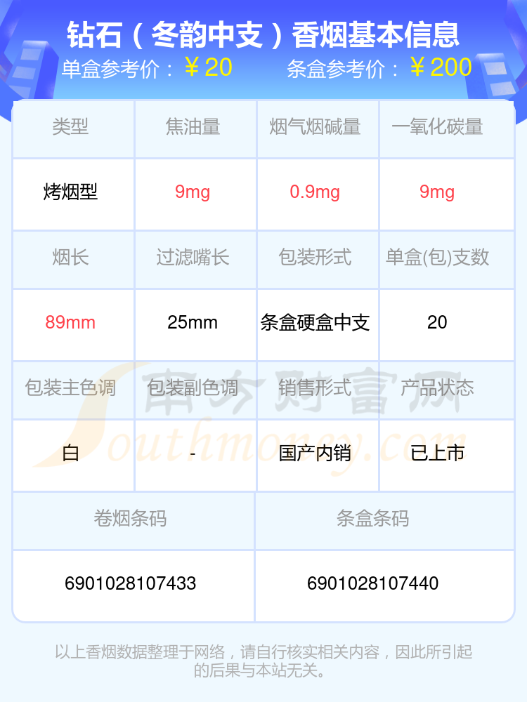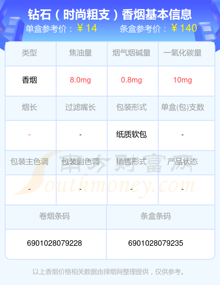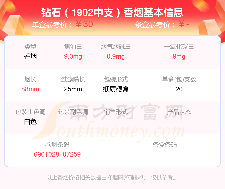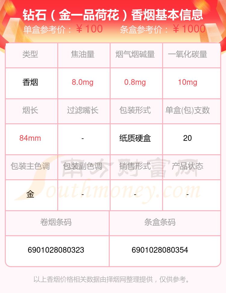 钻石香烟焦油量10mg以下的烟有哪些?择烟网为大家整理提供,分别有:钻石(1902中支)、钻石(荷花经典中支)、钻石(冬韵中支)、钻石(金一品荷花)、钻石(风尚心世界)、钻石(时尚粗支)、钻石(金石)、钻石(蓝时尚细支)、钻石(一品荷花)、钻石(硬红120)等,具体价格如下: