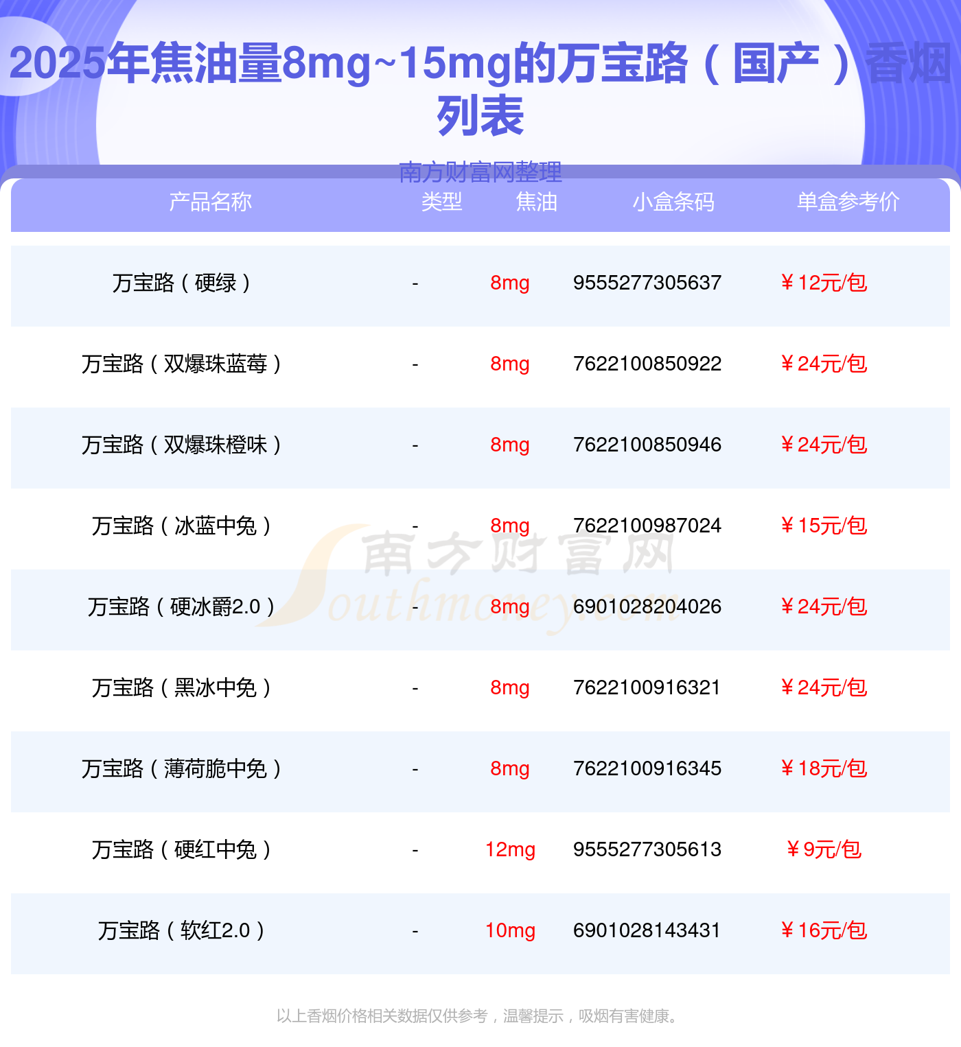 万宝路(国产)香烟焦油量8mg~15mg的烟有万宝路(硬绿)、万宝路(双爆珠蓝莓)、万宝路(双爆珠橙味)、万宝路(冰蓝中兔)、万宝路(硬冰爵2.0)、万宝路(黑冰中免)、万宝路(薄荷脆中免)、万宝路(硬红中兔)、万宝路(软红2.0)等,具体价格如下: