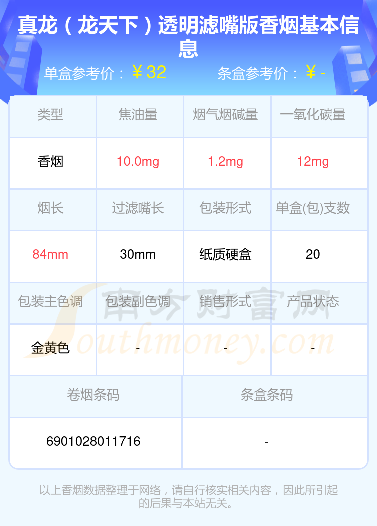 真龙(天翔)参考价8.0元/包、真龙(祥云)参考价10.0元/包、真龙(鸿韵)参考价20.0元/包、真龙(海韵)出口版参考价35.0元/包、真龙(黄金甲)参考价8.0元/包、真龙(灵韵)参考价35.0元/包、真龙(龙天下)透明滤嘴版参考价32.0元/包、真龙(海韵)参考价50.0元/包、真龙(海韵出口版)参考价35元/包、真龙(海纳百川)参考价27.0元/包等。