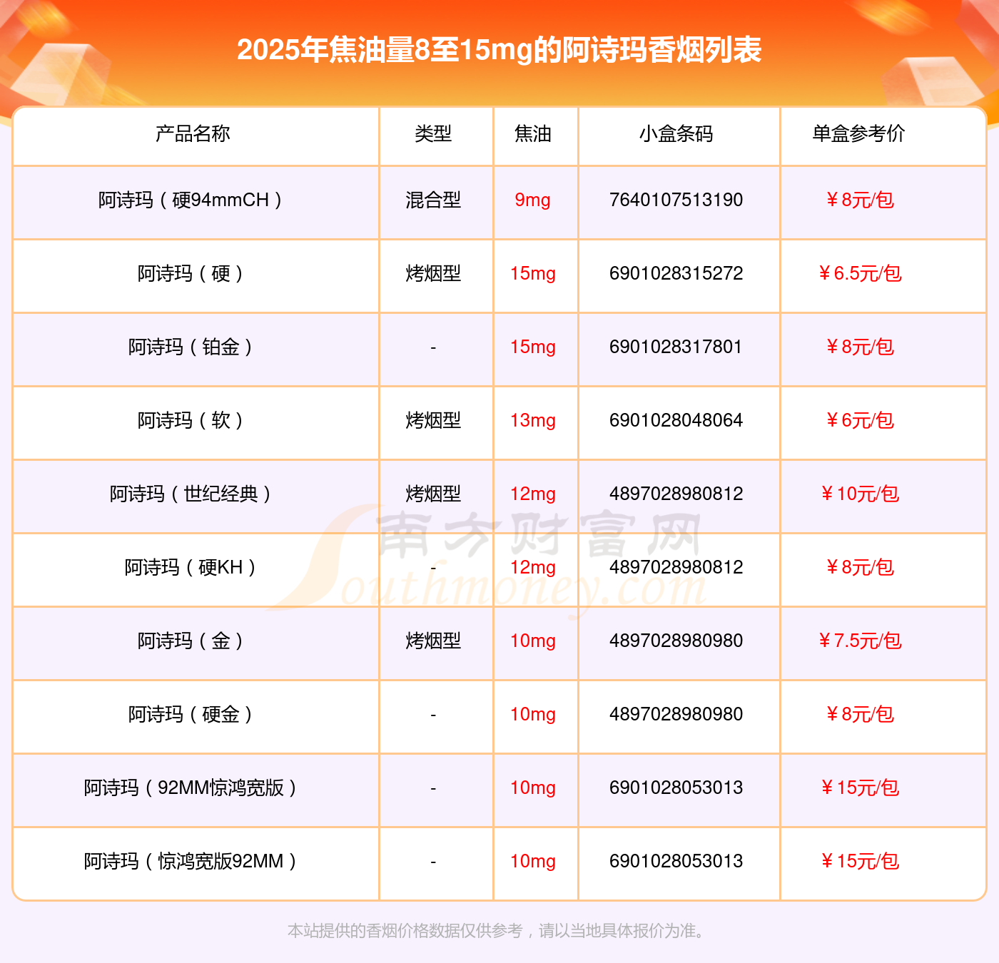 阿诗玛香烟焦油量8至15mg的烟有阿诗玛(硬94mmCH)、阿诗玛(硬)、阿诗玛(铂金)、阿诗玛(软)、阿诗玛(世纪经典)、阿诗玛(硬KH)、阿诗玛(金)、阿诗玛(硬金)、阿诗玛(92MM惊鸿宽版)、阿诗玛(惊鸿宽版92MM)等,详细价格如下: