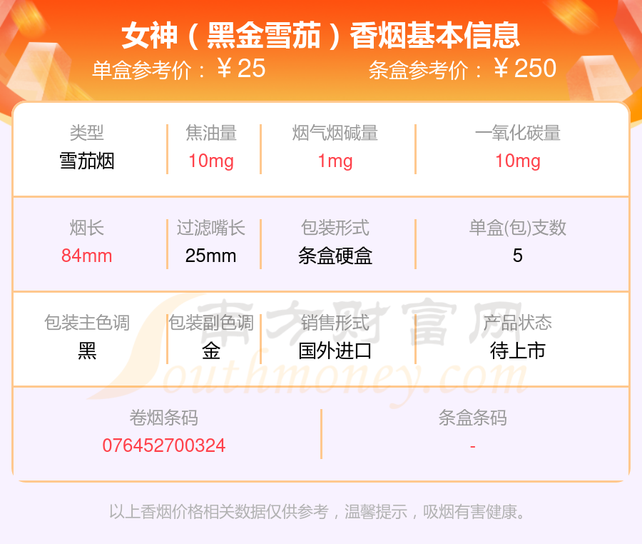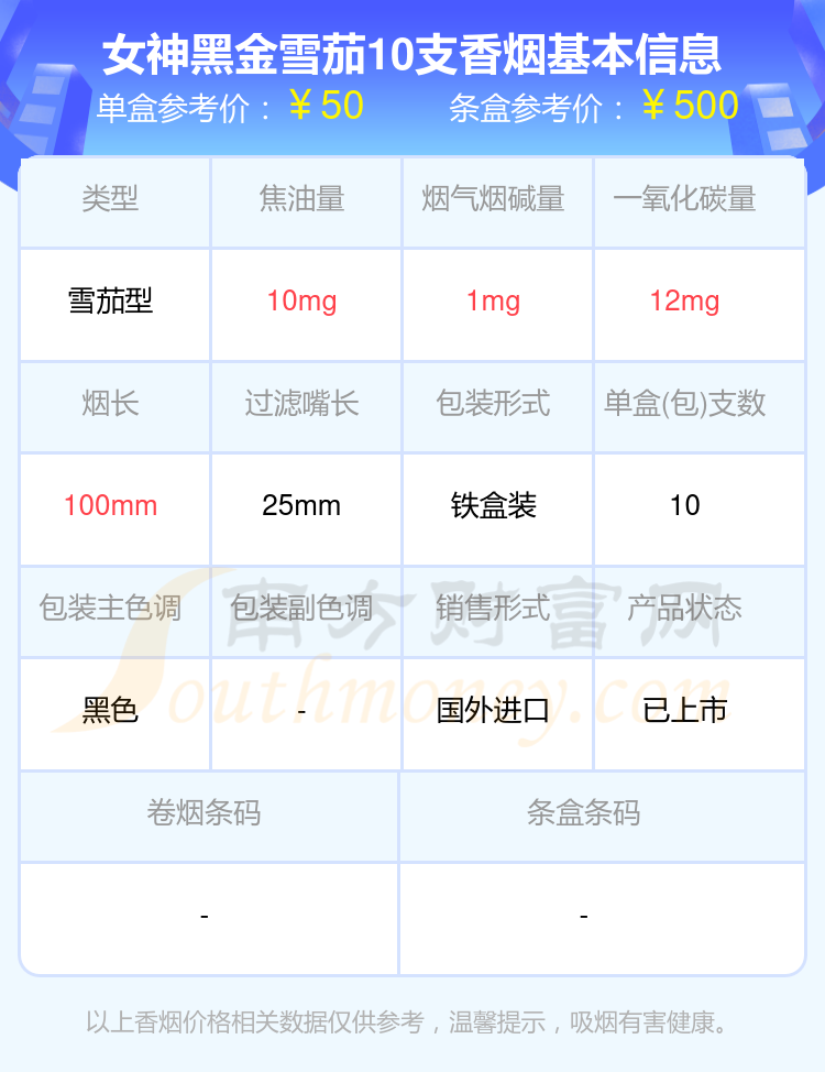 女神黑金雪茄10支参考价50元/包、女神(黑金雪茄)参考价25元/包等。