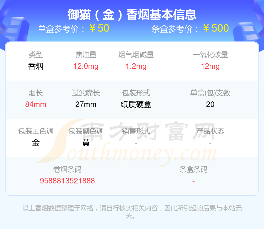 择烟网为大家盘点了五十至九十元的御猫香烟,分别有御猫(瑞草)、御猫(金)等,具体价格如下: