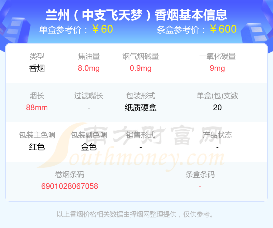 兰州(青藏2号)参考价80.0元/包、兰州(飞天)参考价80.0元/包、兰州(中支飞天梦)参考价60.0元/包等。