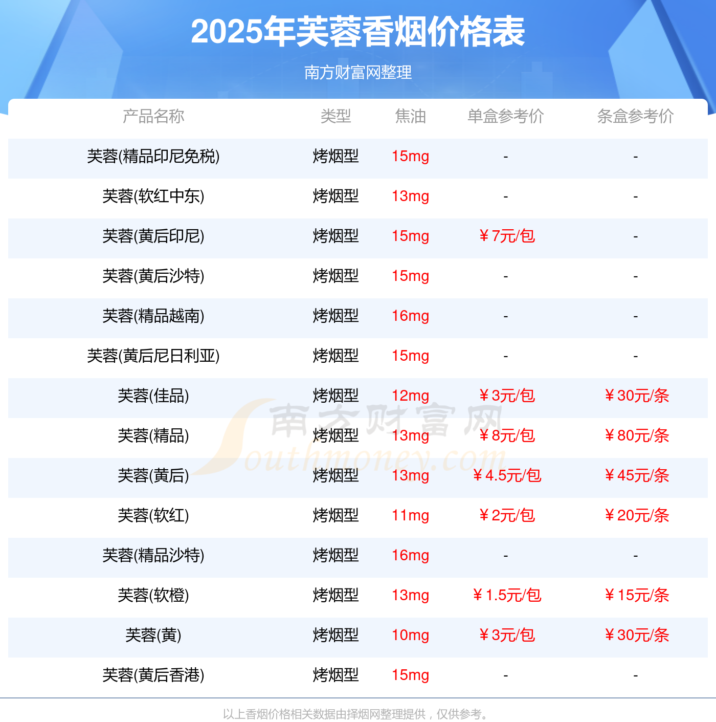2025年,芙蓉(精品)、芙蓉(黄后印尼)、芙蓉(黄后)、芙蓉(佳品)、芙蓉(黄)、芙蓉(软红)、芙蓉(软橙)等芙蓉香烟价格如下:芙蓉(精品)参考价8.0元/包、芙蓉(黄后印尼)参考价7.0元/包、芙蓉(黄后)参考价4.5元/包、芙蓉(佳品)参考价3.0元/包、芙蓉(黄)参考价3.0元/包、芙蓉(软红)参考价2.0元/包、芙蓉(软橙)参考价1.5元/包。