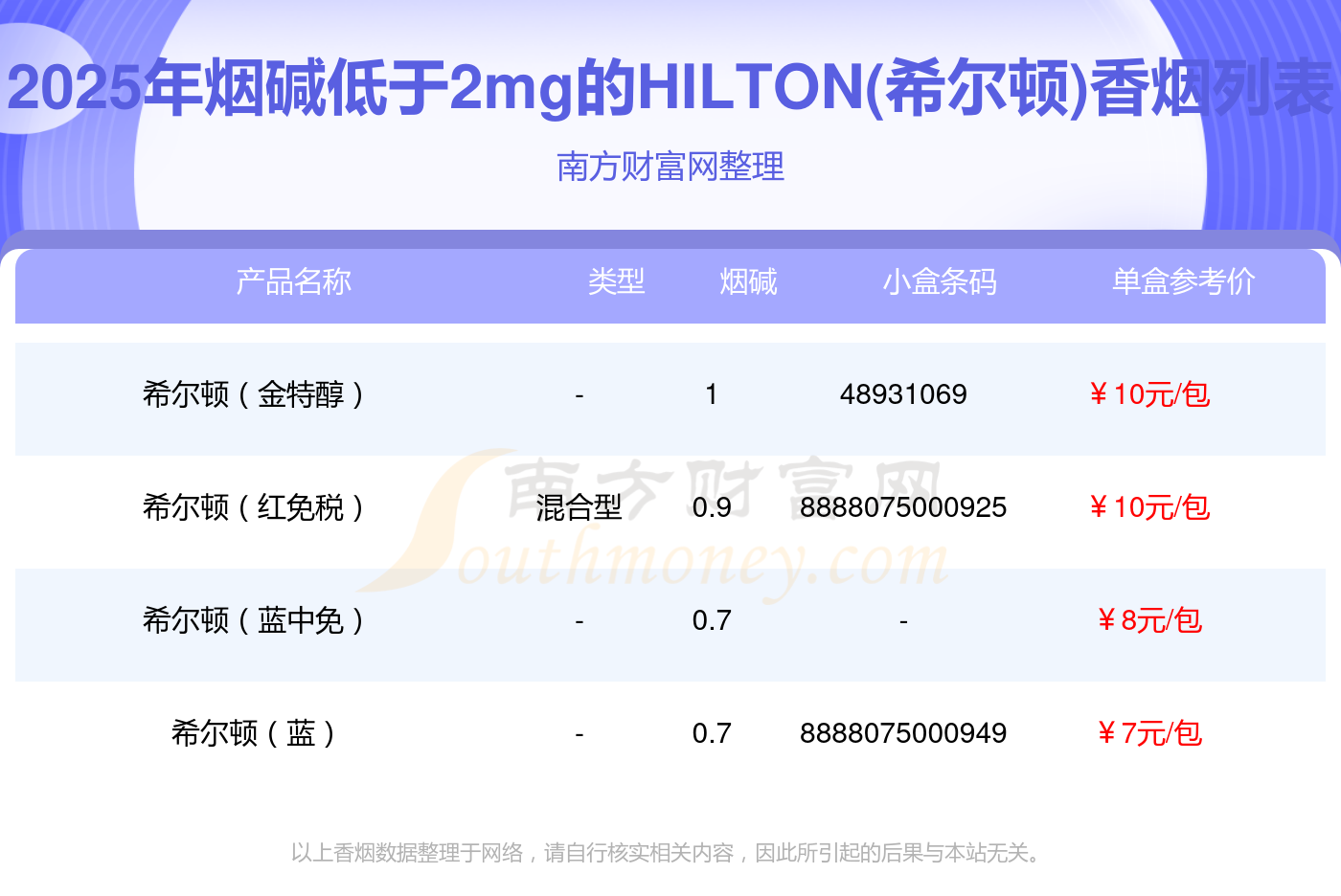 择烟网为大家盘点了HILTON(希尔顿)香烟烟碱低于2mg的,分别有希尔顿(金特醇)、希尔顿(红免税)、希尔顿(蓝中免)、希尔顿(蓝)等,具体价格如下: