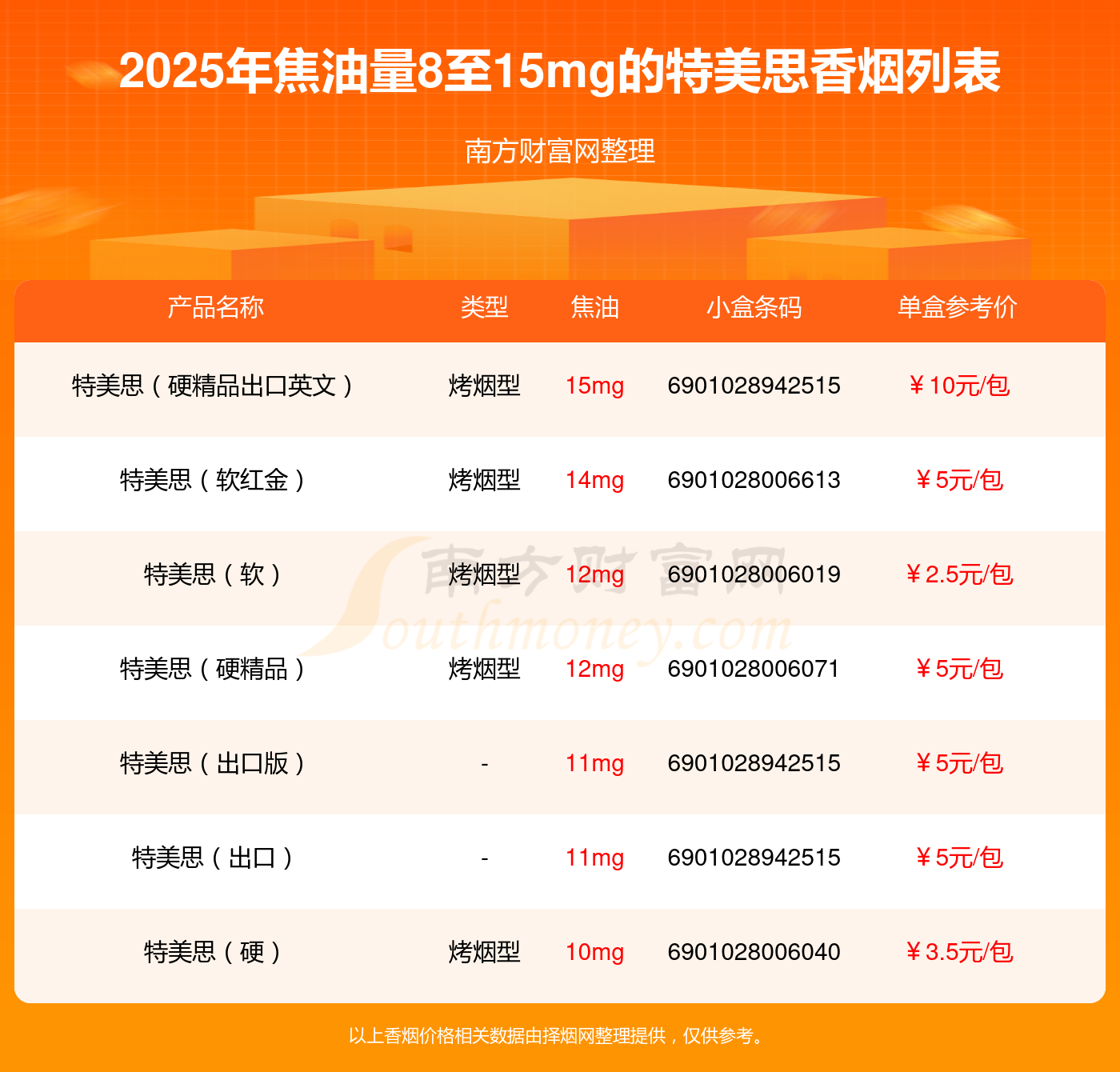 择烟网为大家盘点了特美思香烟焦油量8至15mg的,分别有特美思(硬精品出口英文)、特美思(软红金)、特美思(软)、特美思(硬精品)、特美思(出口版)、特美思(出口)、特美思(硬)等,具体价格如下: