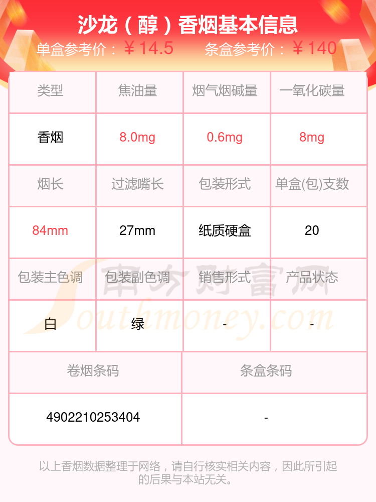 沙龙(醇)参考价14.5元/包、沙龙(醇港版)参考价29元/包、沙龙(绿)参考价18元/包、沙龙(醇美版)参考价10元/包、沙龙(薄荷免税)参考价10元/包、沙龙(超醇免税)参考价9元/包等。