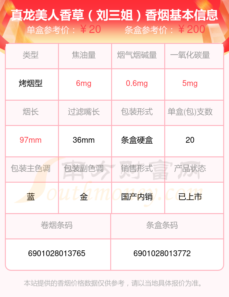 真龙晶钻刘三姐参考价30元/包、真龙美人香草(刘三姐)参考价20元/包、真龙(刘三姐)真龙美人香草参考价30元/包等。