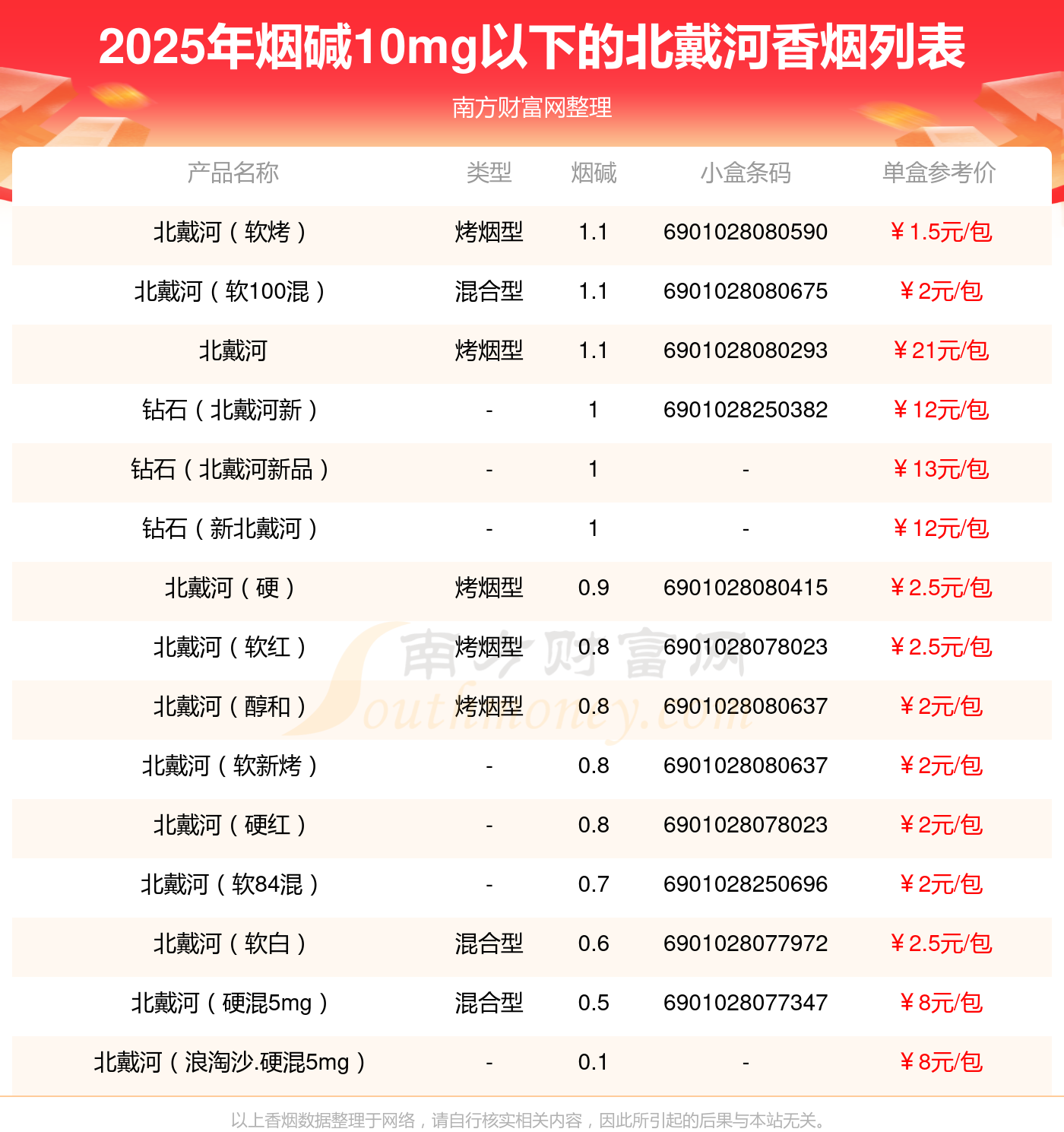 择烟网为大家盘点了烟碱10mg以下的北戴河香烟,分别有北戴河(软烤)、北戴河(软100混)、北戴河、钻石(北戴河新)、钻石(北戴河新品)、钻石(新北戴河)、北戴河(硬)、北戴河(软红)、北戴河(醇和)、北戴河(软新烤)等,具体价格如下: