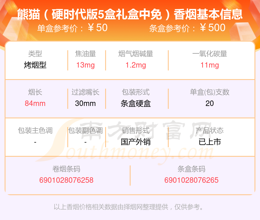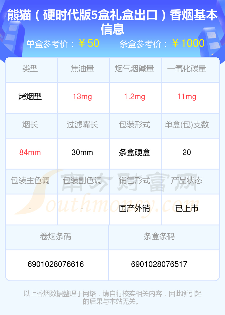 熊猫香烟焦油量8mg至15mg的烟有哪些?择烟网为大家整理提供,分别有:熊猫(硬5盒时代版出口)、熊猫(硬时代版5盒礼盒出口)、熊猫(硬时代版5盒礼盒中免)、熊猫(典藏出口版)、熊猫(硬时代版)、熊猫(硬时代)、熊猫(硬经典)、熊猫(听50支)等,具体价格如下: