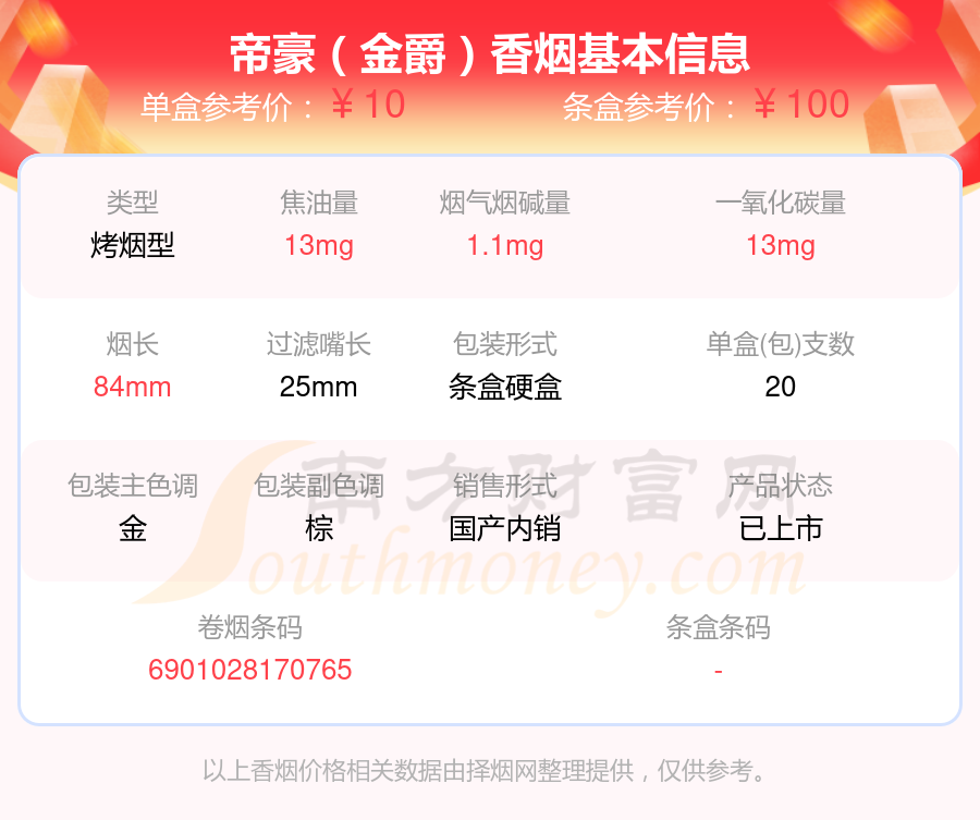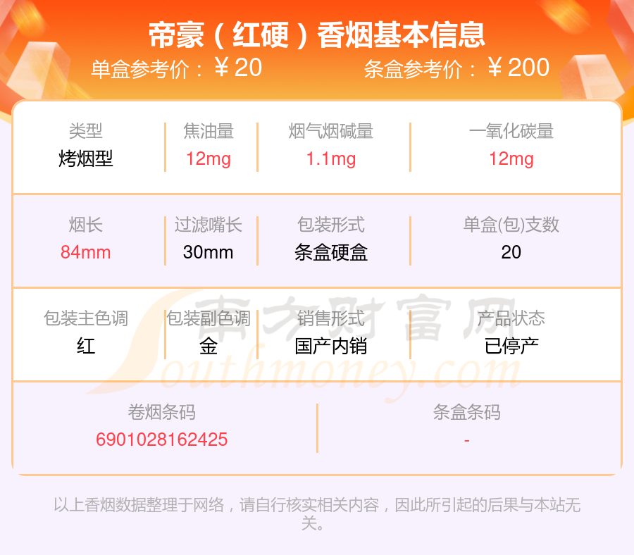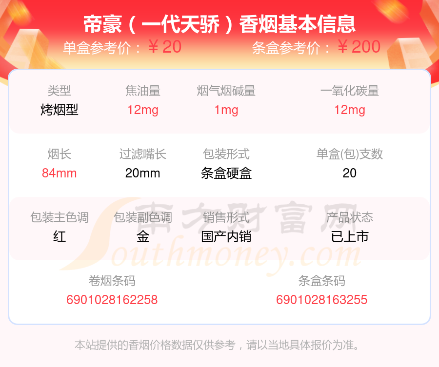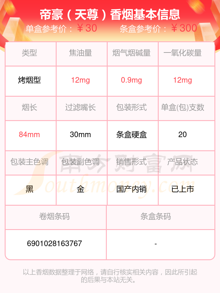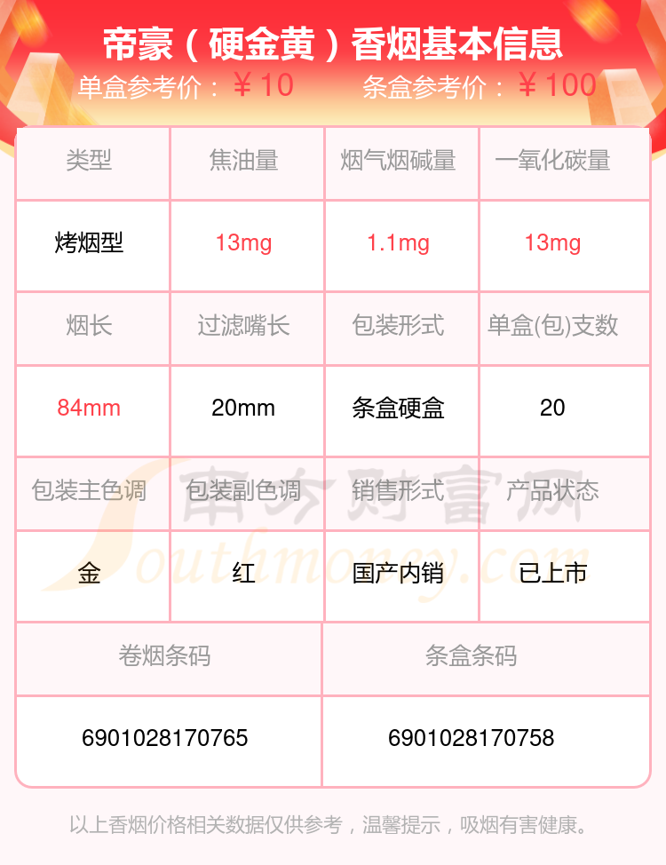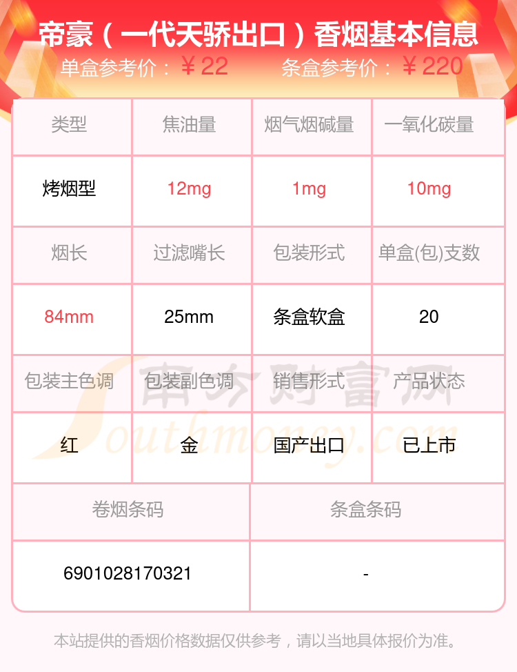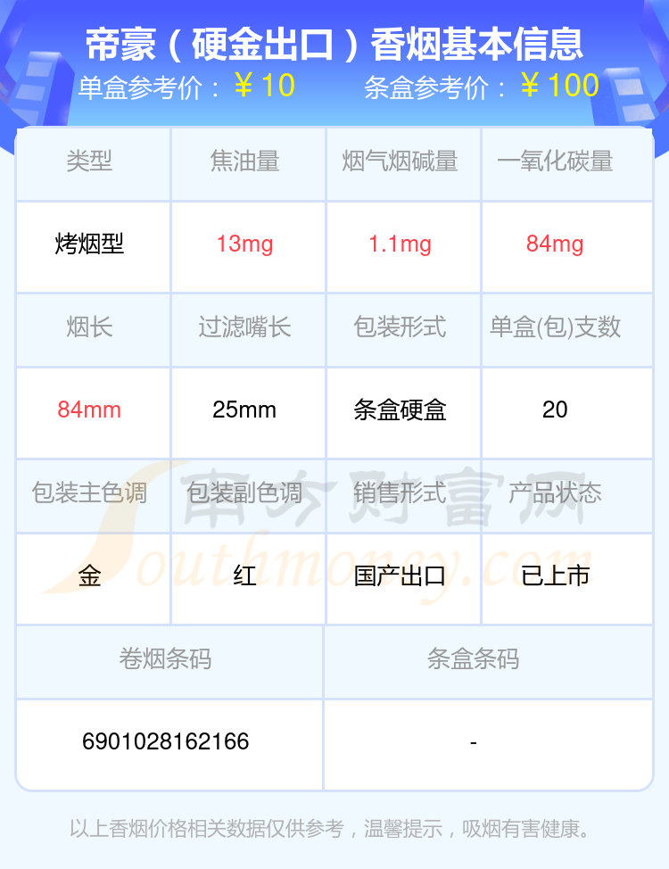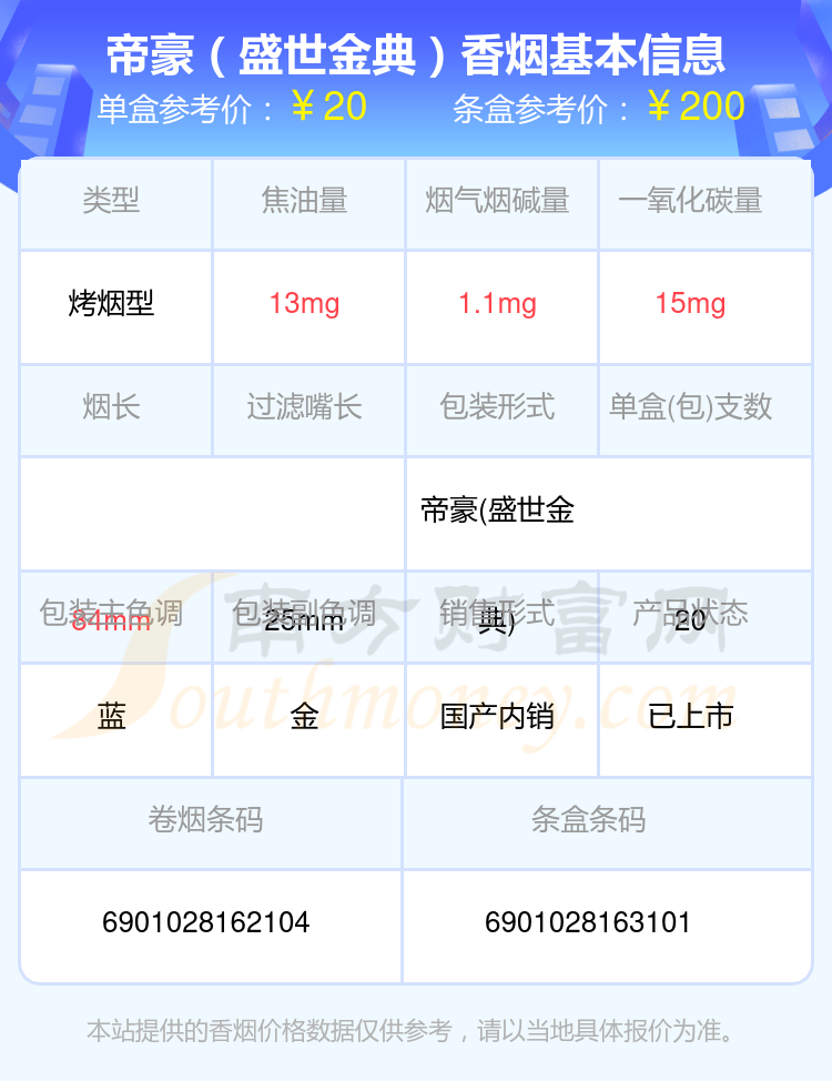 帝豪(金爵)参考价10元/包、帝豪(硬金黄)参考价10元/包、帝豪(盛世金典)参考价20元/包、帝豪(硬金出口)参考价10元/包、帝豪(红硬)参考价20元/包、帝豪(一代天骄出口)参考价22元/包、帝豪(一代天骄)参考价20元/包、帝豪(风华)参考价15元/包、帝豪(天尊)参考价30元/包、帝豪(国风)参考价30元/包等。