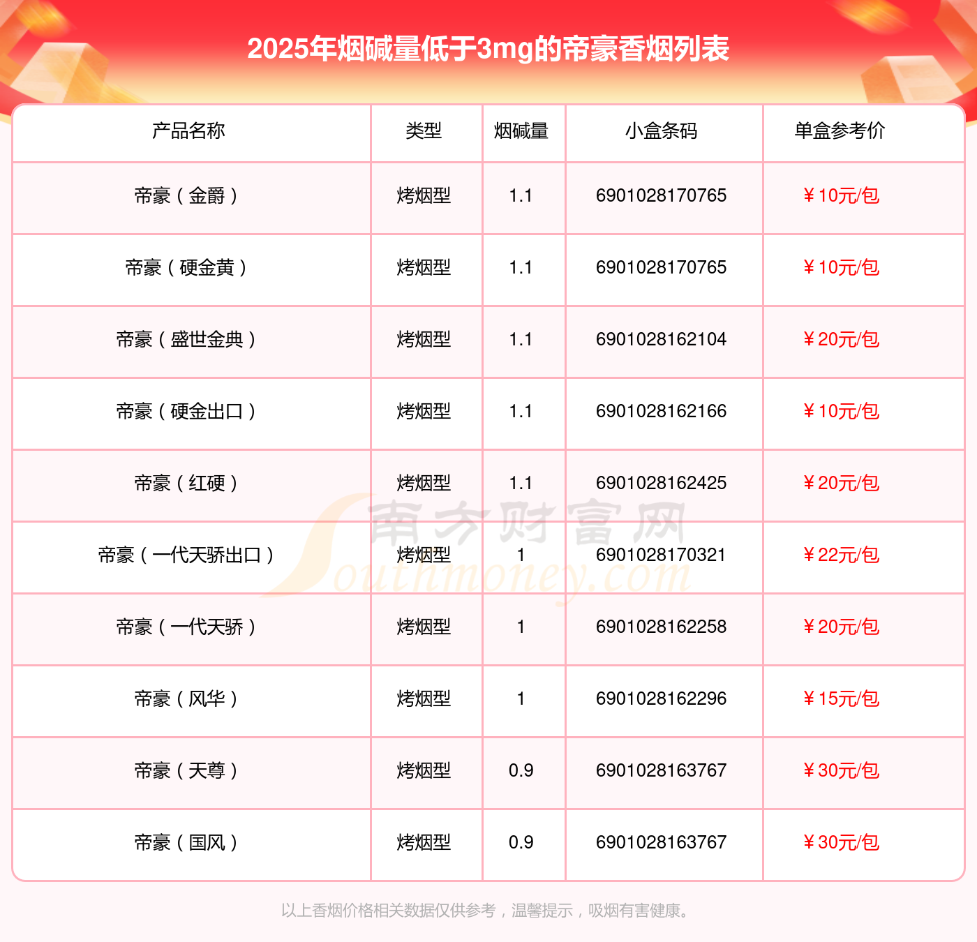 烟碱量低于3mg的帝豪香烟有哪些?择烟网为大家整理盘点,有帝豪(金爵)、帝豪(硬金黄)、帝豪(盛世金典)、帝豪(硬金出口)、帝豪(红硬)、帝豪(一代天骄出口)、帝豪(一代天骄)、帝豪(风华)、帝豪(天尊)、帝豪(国风)等,详细价格如下: