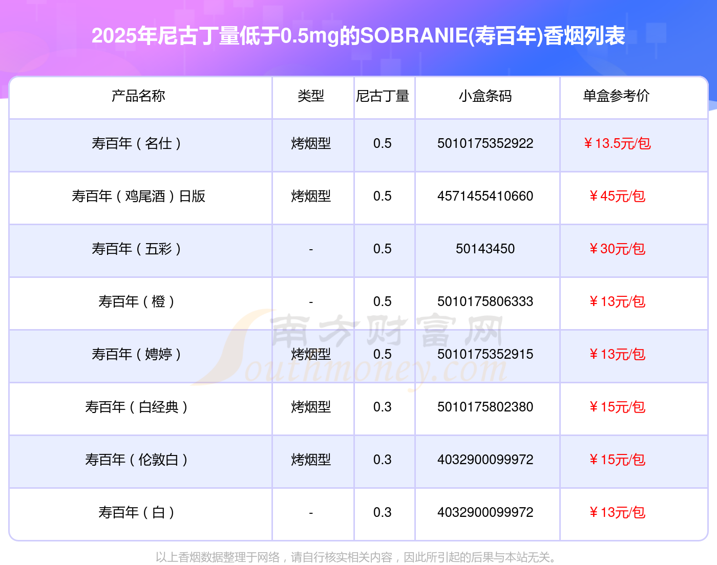 寿百年(名仕)参考价13.5元/包、寿百年(鸡尾酒)日版参考价45.0元/包、寿百年(五彩)参考价30元/包、寿百年(橙)参考价13元/包、寿百年(娉婷)参考价13.0元/包、寿百年(白经典)参考价15.0元/包、寿百年(伦敦白)参考价15.0元/包、寿百年(白)参考价13元/包等。