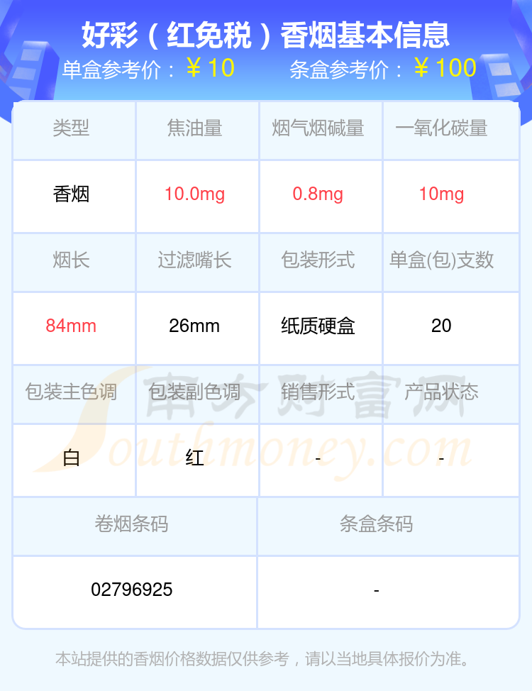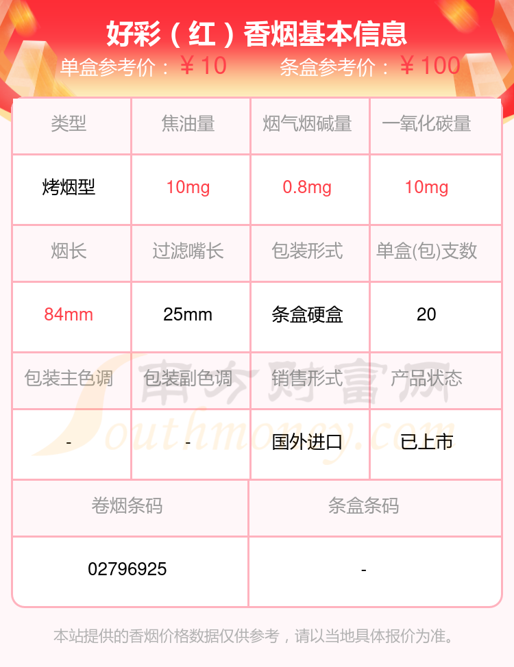 好彩(红)参考价10元/包、好彩(红免税)参考价10.0元/包、好彩(绿港版)参考价29.0元/包、好彩(黑中免)参考价12.0元/包、好彩(蓝中免)参考价12.0元/包、好彩(薄荷中免)参考价18.0元/包、好彩(薄荷银中免)参考价12.5元/包等。
