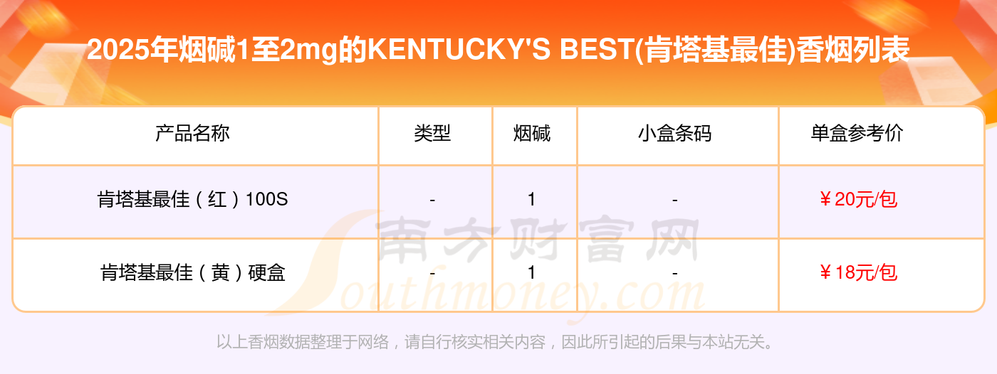 择烟网为大家盘点了KENTUCKY'S BEST(肯塔基最佳)香烟烟碱1至2mg的,分别有肯塔基最佳(红)100S、肯塔基最佳(黄)硬盒等,具体价格如下:
