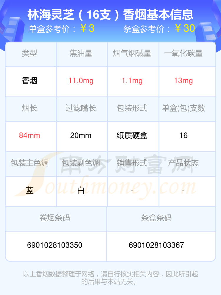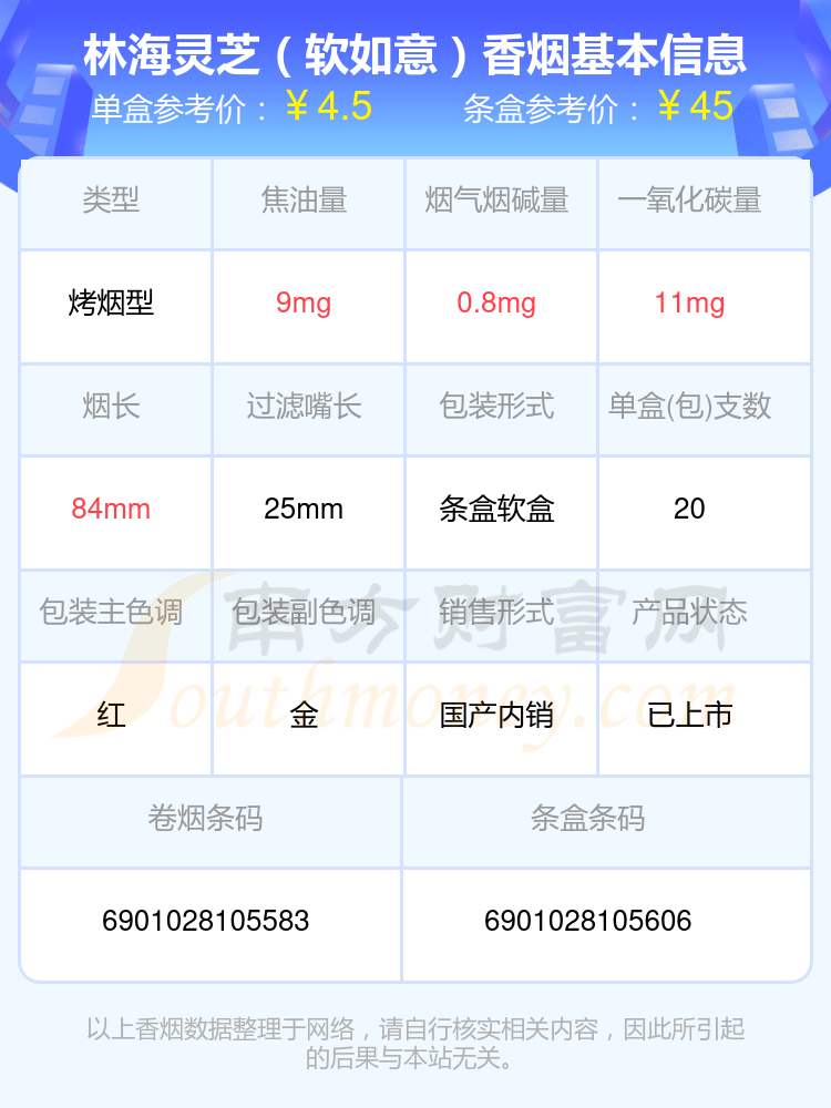 林海灵芝香烟尼古丁量低于5mg的烟分别有林海灵芝(软红)参考价2元/包、林海灵芝(16支)参考价3.0元/包、林海灵芝(硬红)参考价5.5元/包、林海灵芝(如意)参考价4.5元/包、林海灵芝(硬白)参考价3.0元/包、林海灵芝(蓝色经典)参考价4元/包、林海灵芝(祥瑞8mg)参考价5.5元/包、林海灵芝(软如意)参考价4.5元/包、林海灵芝(印象)参考价6.5元/包、林海灵芝(软白)参考价3元/包等。