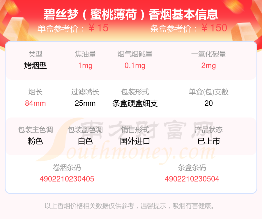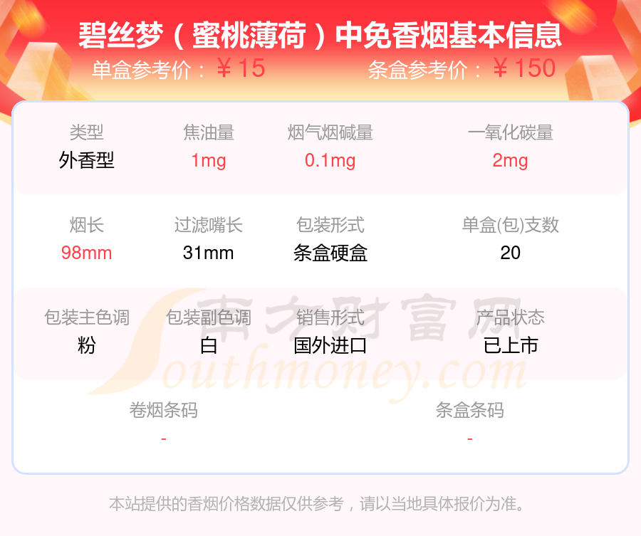 Pianissimo Lucia参考价31.0元/包、碧丝梦(绿薄荷)参考价15元/包、碧丝梦(蜜桃薄荷)参考价15元/包、碧丝梦(蜜桃薄荷)中免参考价15元/包等。