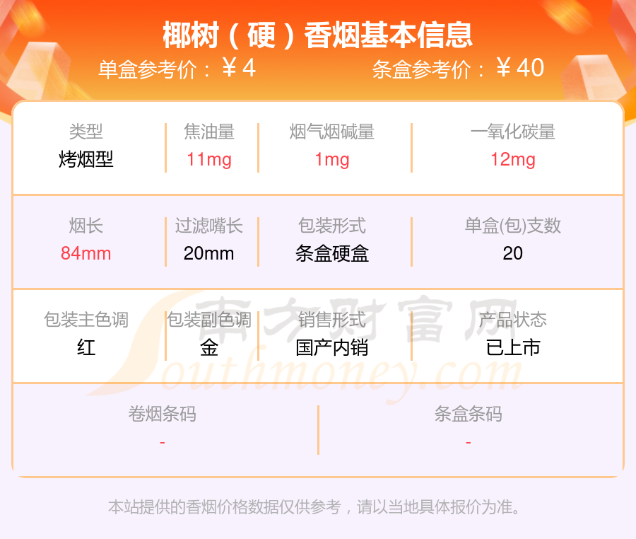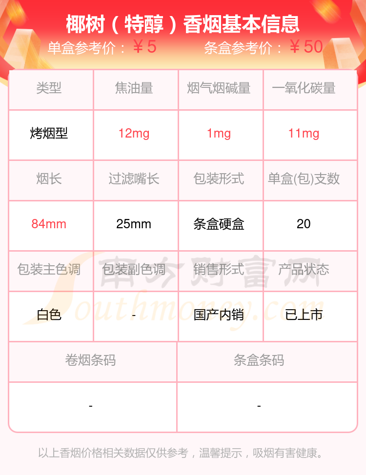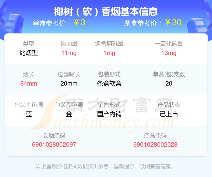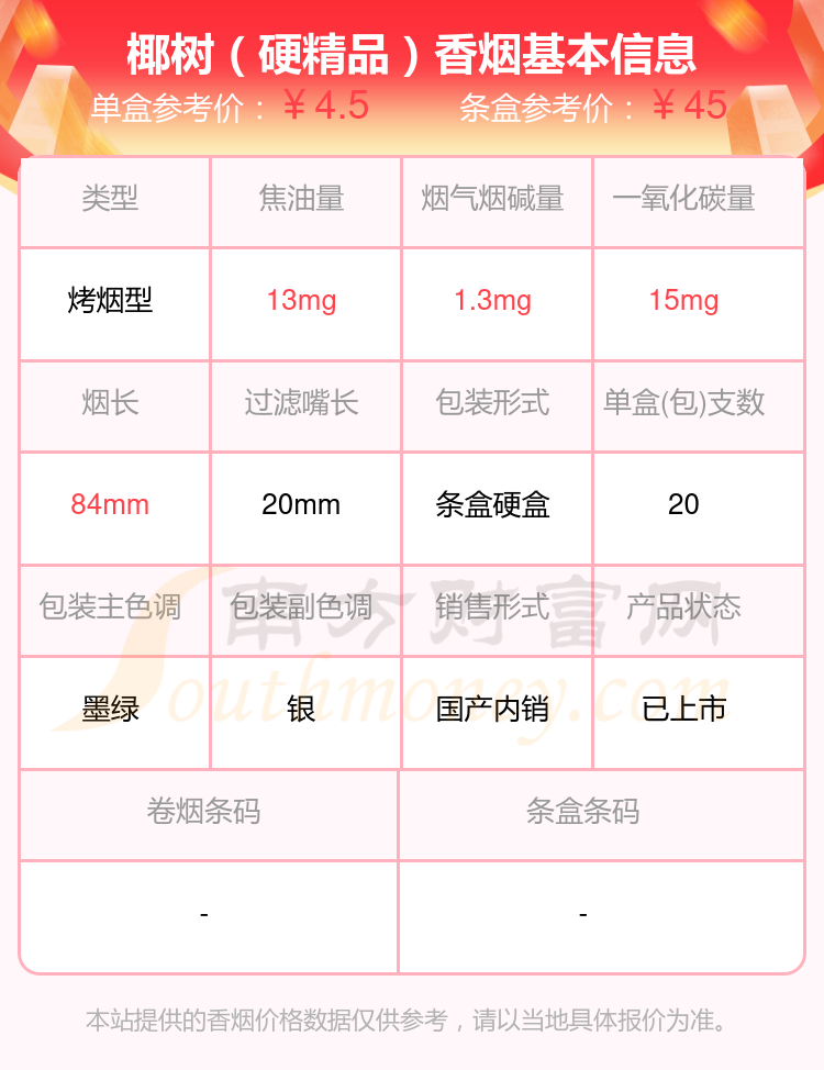 择烟网为大家盘点了烟碱量4mg以下的椰树香烟,分别有椰树(硬精品)、椰树(硬绿)、椰树(软)、椰树(硬)、椰树(特醇)等,具体价格如下: