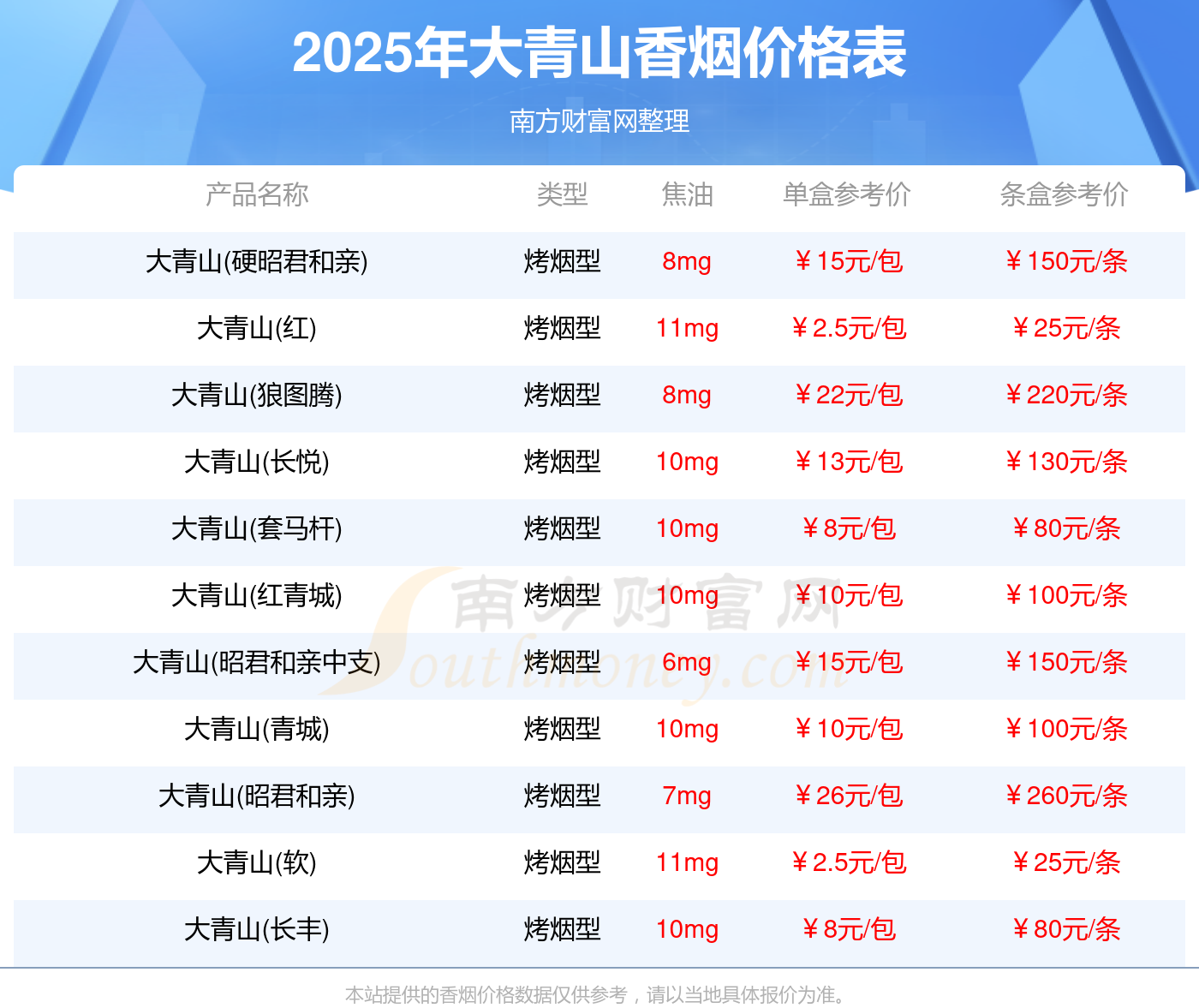 2025年大青山香烟大青山(昭君和亲)、大青山(狼图腾)、大青山(昭君和亲中支)、大青山(硬昭君和亲)、大青山(长悦)、大青山(红青城)等最新价格如下:大青山(昭君和亲)参考价26.0元/包、大青山(狼图腾)参考价22.0元/包、大青山(昭君和亲中支)参考价15.0元/包、大青山(硬昭君和亲)参考价15.0元/包、大青山(长悦)参考价13.0元/包、大青山(红青城)参考价10.0元/包。