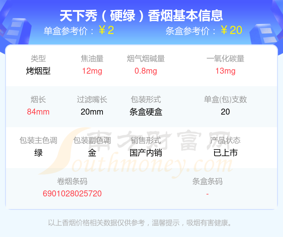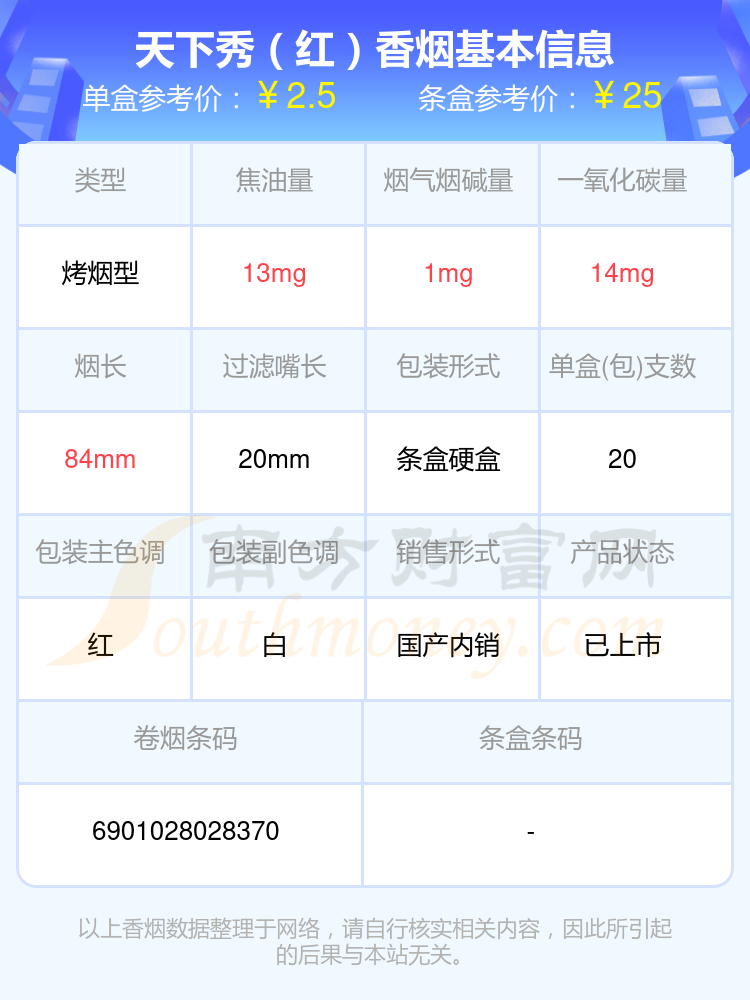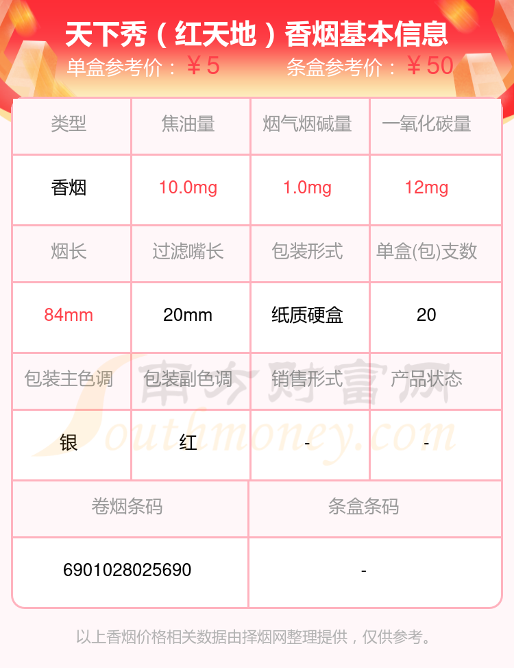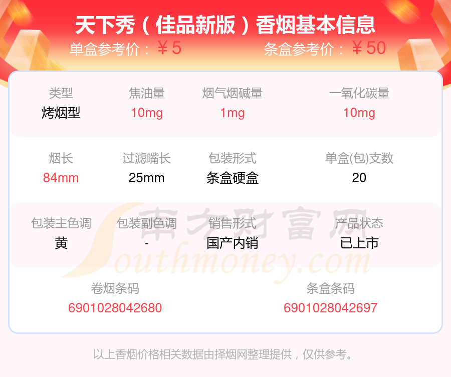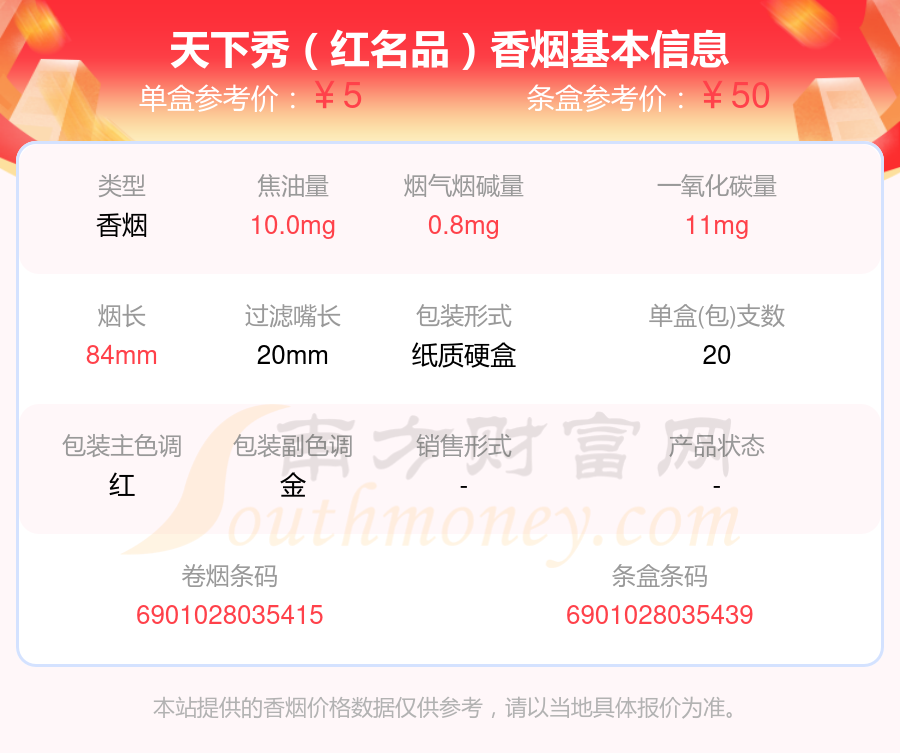 天下秀(红天地)参考价5.0元/包、天下秀(佳品新版)参考价5元/包、天下秀(佳品)参考价3元/包、天下秀(红)参考价2.5元/包、天下秀(金)参考价6.0元/包、天下秀(红名品)参考价5.0元/包、天下秀(硬绿)参考价2元/包、天下秀(软特醇)参考价1.5元/包等。