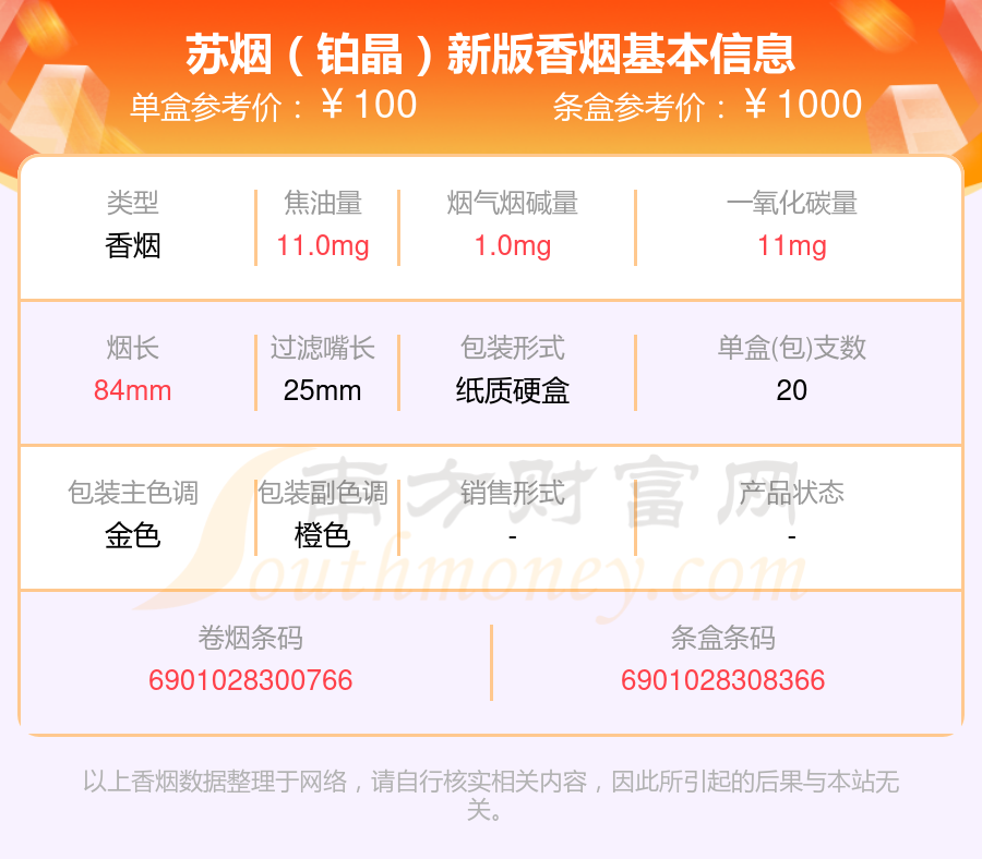 苏烟(金砂2)参考价90.0元/包、苏烟(格)参考价80元/包、苏烟(好风光)参考价75.0元/包、苏烟(新星)参考价70.0元/包、苏烟(濠河)参考价70.0元/包、苏烟(晶彩中支)参考价70元/包、苏烟(瑞星)参考价65.0元/包、苏烟(铂晶)新版参考价100.0元/包、苏烟(铂晶)参考价100.0元/包、苏烟(天星)参考价100.0元/包等。