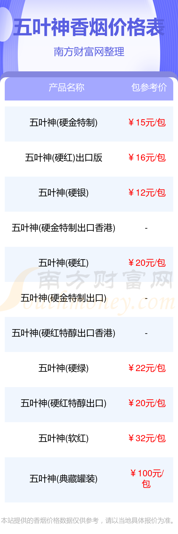 五叶神(典藏罐装)参考价100.0元/包、五叶神(软红)参考价32.0元/包、五叶神(硬绿)参考价22.0元/包、五叶神(硬红特醇出口)参考价20.0元/包、五叶神(硬红)参考价20.0元/包、五叶神(硬红)出口版参考价16.0元/包。