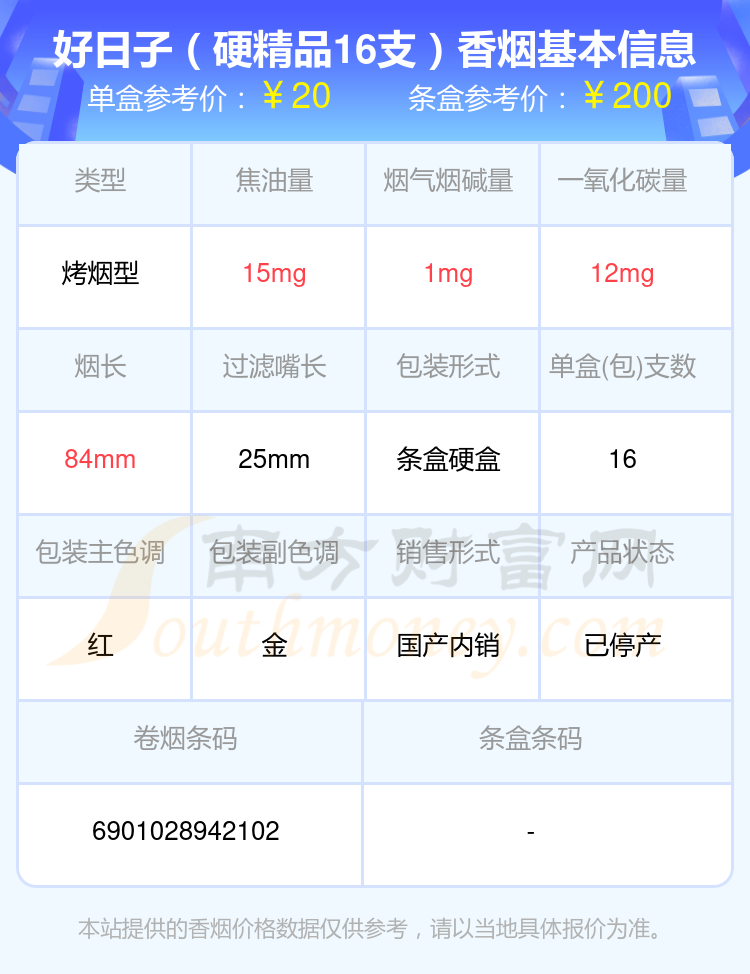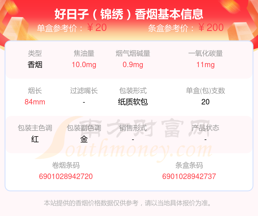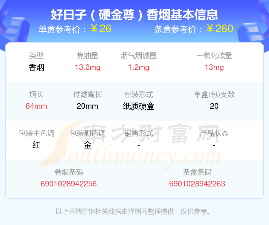 择烟网为大家盘点了好日子香烟二十到四十元的,分别有好日子(硬金尊)、好日子(锦绣)、好日子(硬精品16支)等,详细价格如下: