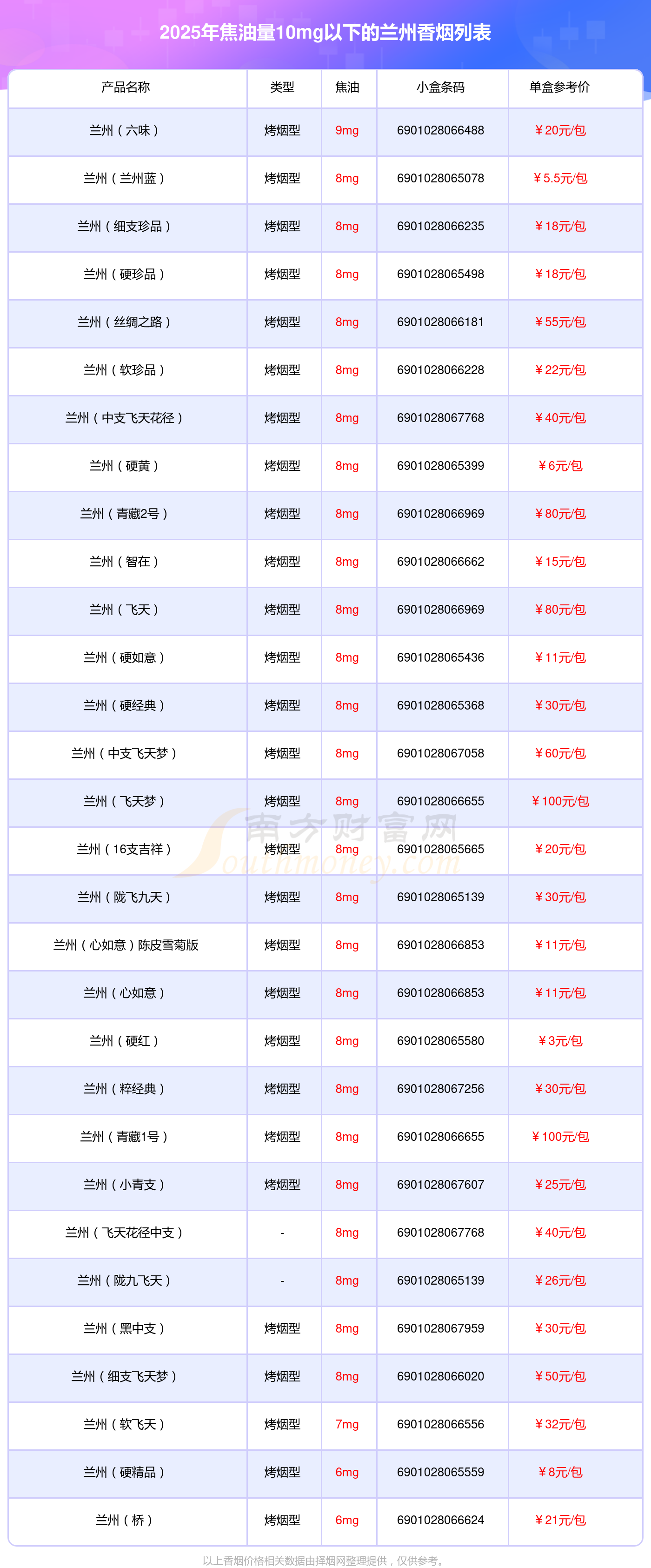 择烟网为大家盘点了兰州香烟焦油量10mg以下的,分别有兰州(六味)、兰州(兰州蓝)、兰州(细支珍品)、兰州(硬珍品)、兰州(丝绸之路)、兰州(软珍品)、兰州(中支飞天花径)、兰州(硬黄)、兰州(青藏2号)、兰州(智在)等,具体价格如下: