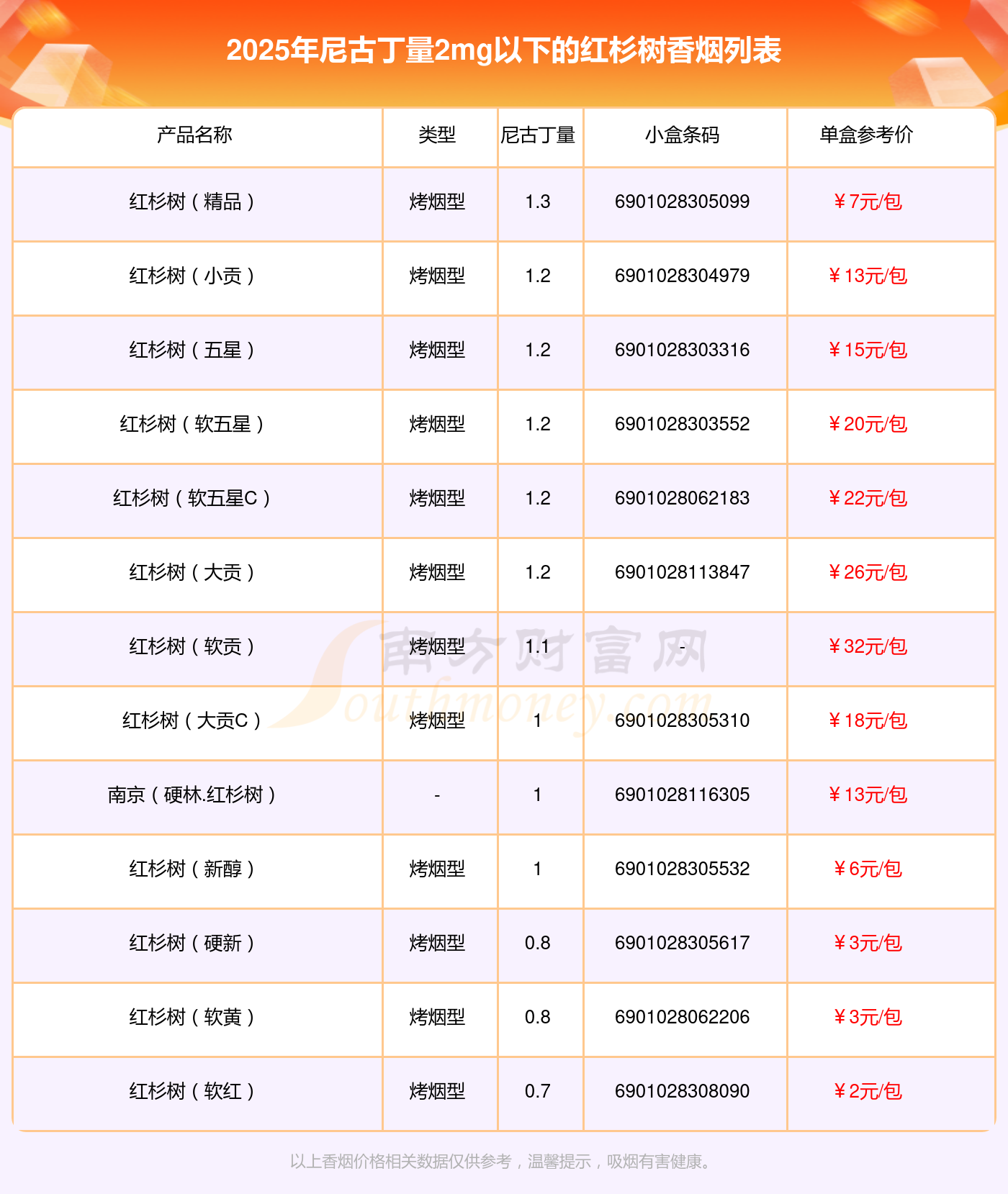 尼古丁量2mg以下的红杉树香烟有哪些?择烟网为大家整理盘点,分别有:红杉树(精品)、红杉树(小贡)、红杉树(五星)、红杉树(软五星)、红杉树(软五星C)、红杉树(大贡)、红杉树(软贡)、红杉树(大贡C)、南京(硬林.红杉树)、红杉树(新醇)等,具体价格如下: