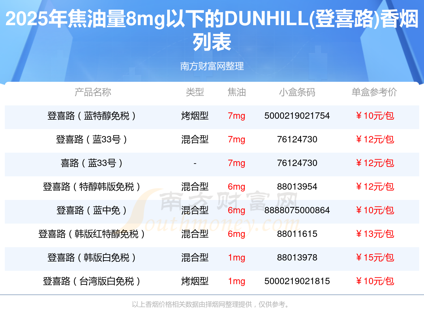 择烟网为大家盘点了焦油量8mg以下的DUNHILL(登喜路)香烟,分别有登喜路(蓝特醇免税)、登喜路(蓝33号)、喜路(蓝33号)、登喜路(特醇韩版免税)、登喜路(蓝中免)、登喜路(韩版红特醇免税)、登喜路(韩版白免税)、登喜路(台湾版白免税)等,具体价格如下: