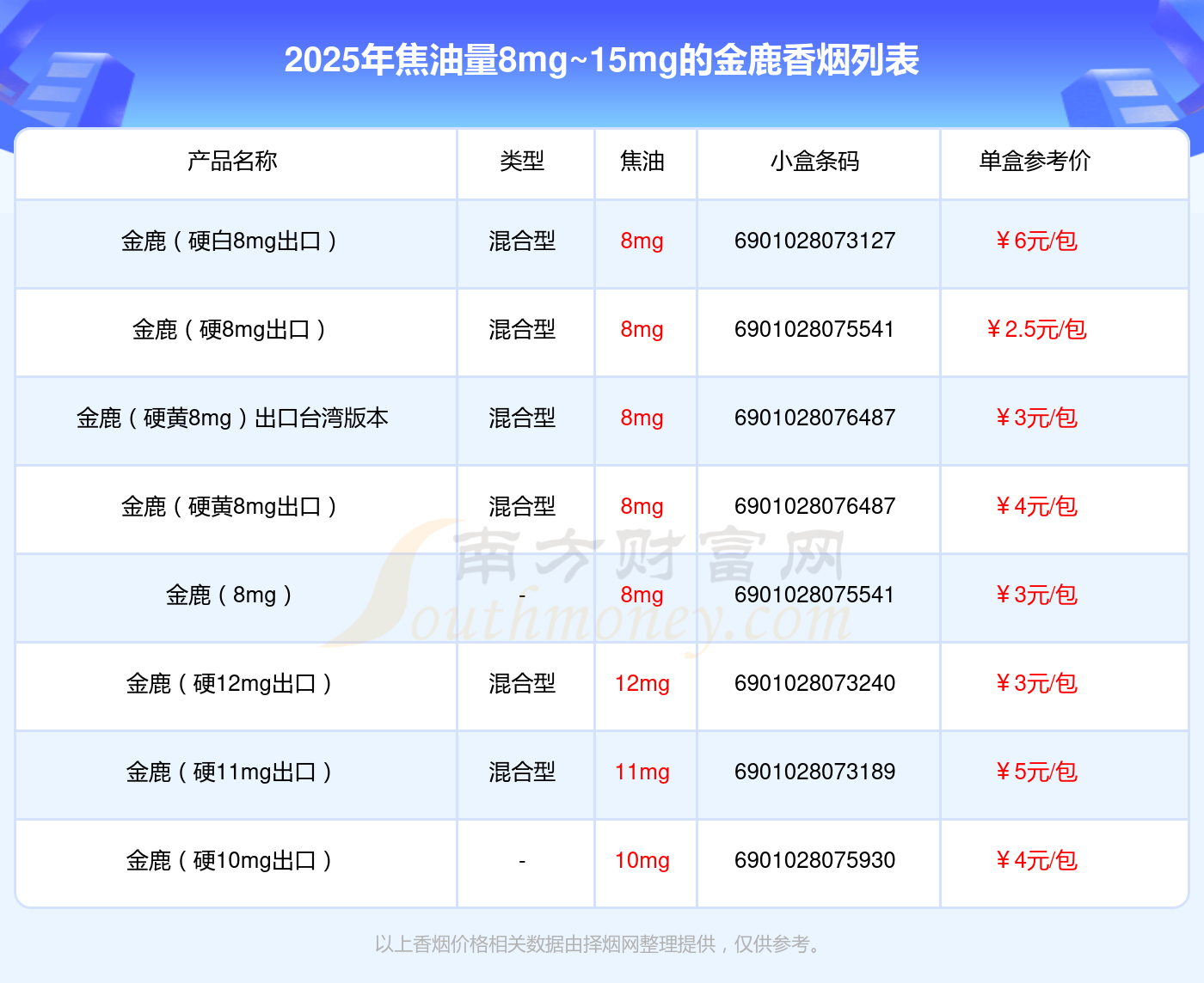 金鹿香烟焦油量8mg~15mg的烟有金鹿(硬白8mg出口)、金鹿(硬8mg出口)、金鹿(硬黄8mg)出口台湾版本、金鹿(硬黄8mg出口)、金鹿(8mg)、金鹿(硬12mg出口)、金鹿(硬11mg出口)、金鹿(硬10mg出口)等,具体价格如下: