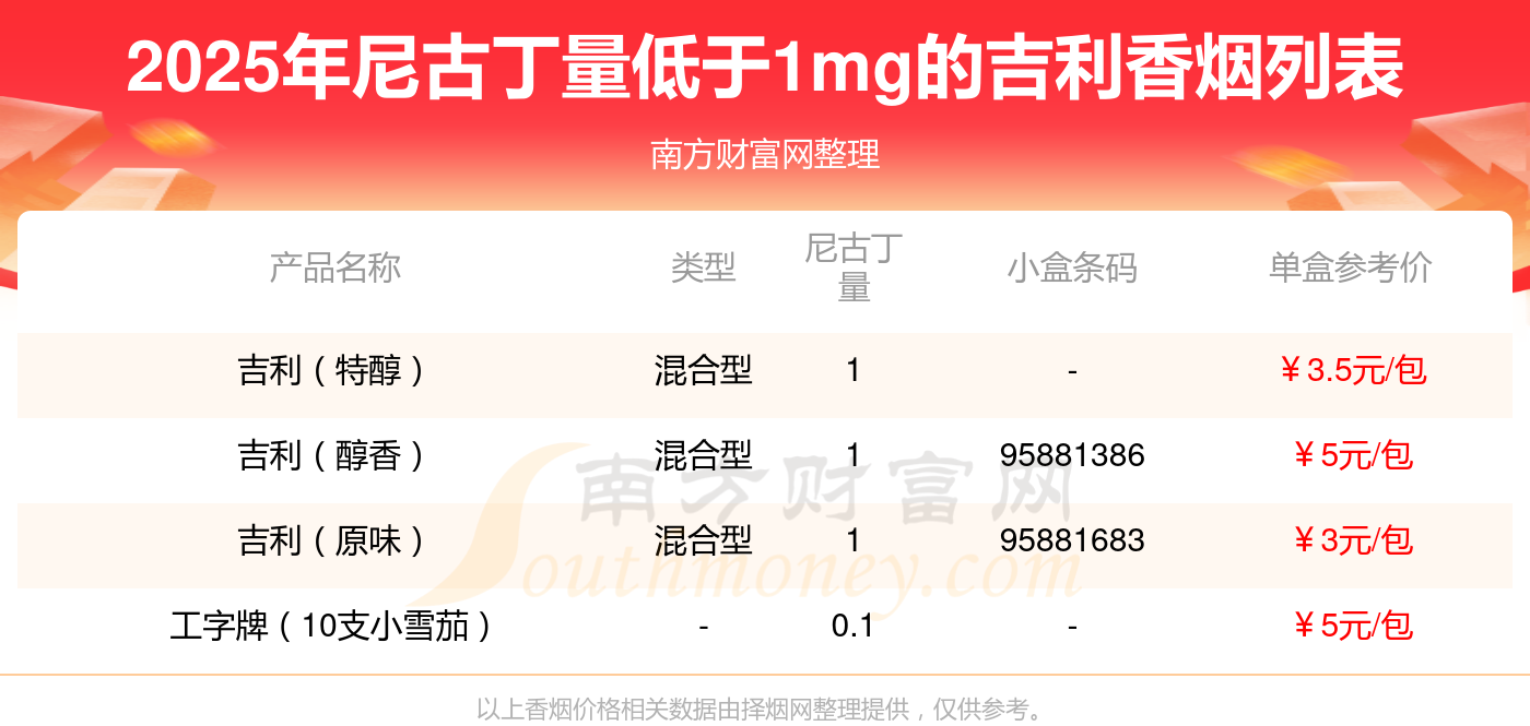 择烟网为大家盘点了吉利香烟尼古丁量低于1mg的,分别有吉利(特醇)、吉利(醇香)、吉利(原味)、工字牌(10支小雪茄)等,详细价格如下: