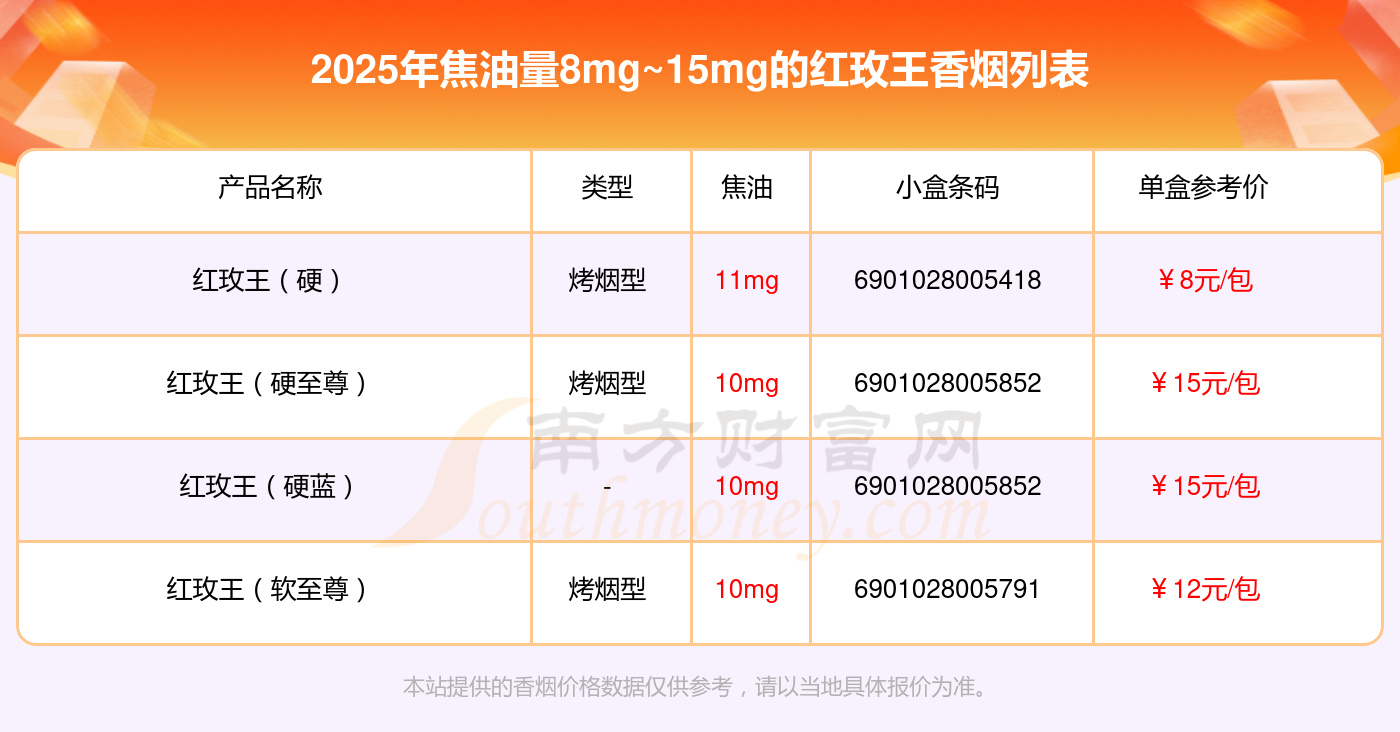 红玫王(硬)参考价8元/包、红玫王(硬至尊)参考价15.0元/包、红玫王(硬蓝)参考价15元/包、红玫王(软至尊)参考价12元/包等。