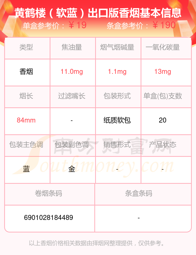 黄鹤楼(硬磨砂出口)参考价15.0元/包、黄鹤楼(硬金砂)参考价15.0元/包、黄鹤楼(硬雪之韵)参考价50.0元/包、黄鹤楼(软长论道)参考价33.0元/包、黄鹤楼(雅香红硬)参考价20.0元/包、黄鹤楼(硬蓝)参考价20.0元/包、黄鹤楼(南洋叁號)参考价15.0元/包、黄鹤楼(硬金砂龙烟)参考价15.0元/包、黄鹤楼(软雅香·忆恩)参考价26.0元/包、黄鹤楼(软蓝)出口版参考价19.0元/包等。