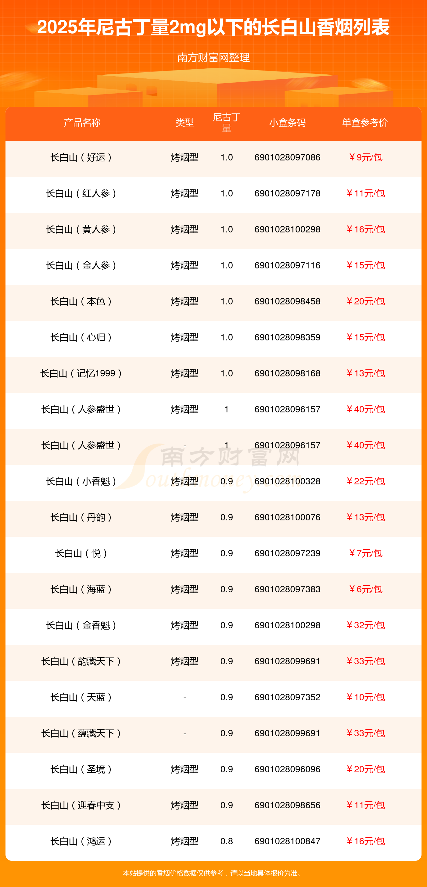 择烟网为大家盘点了长白山香烟尼古丁量2mg以下的,分别有长白山(好运)、长白山(红人参)、长白山(黄人参)、长白山(金人参)、长白山(本色)、长白山(心归)、长白山(记忆1999)、长白山(人参盛世)、长白山(人参盛世)、长白山(小香魁)等,具体价格如下: