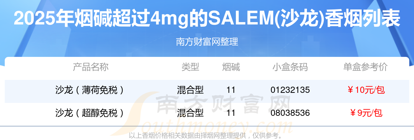 SALEM(沙龙)香烟烟碱超过4mg的烟2025列表一览