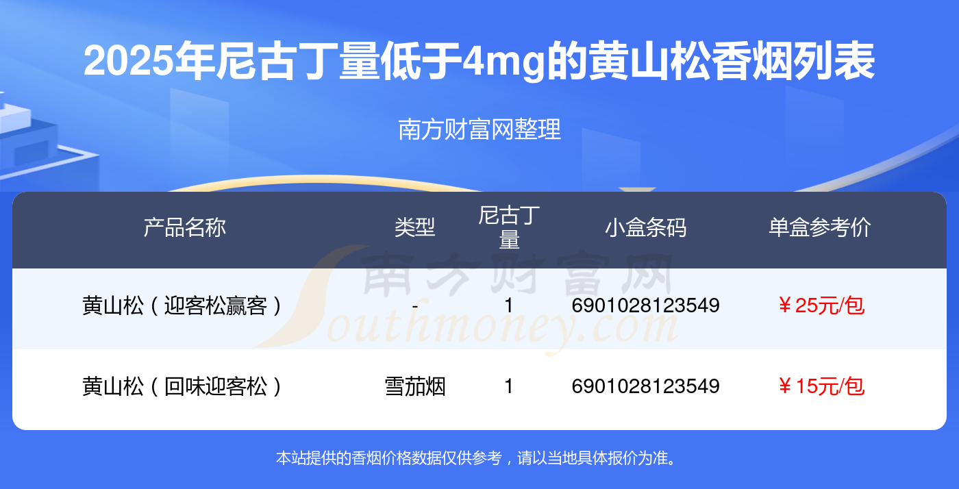 黄山松香烟尼古丁量低于4mg的有哪些?择烟网为大家整理提供,分别有: