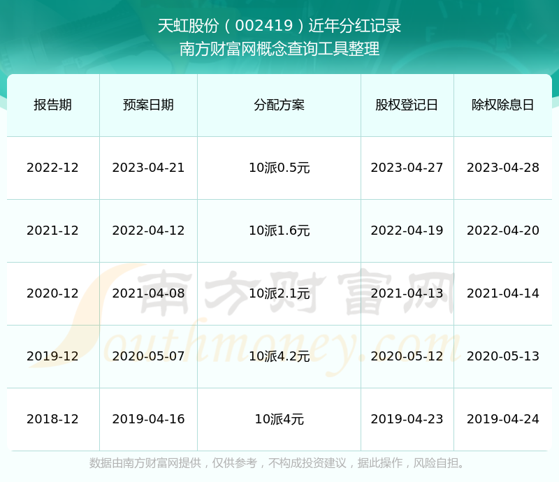 天虹股份最新一次公布的分红方案为10派0.5元。本次权益分派股权登记日为2023年4月27日,除权除息日为2023年4月28日,派息日为2023年4月28日。