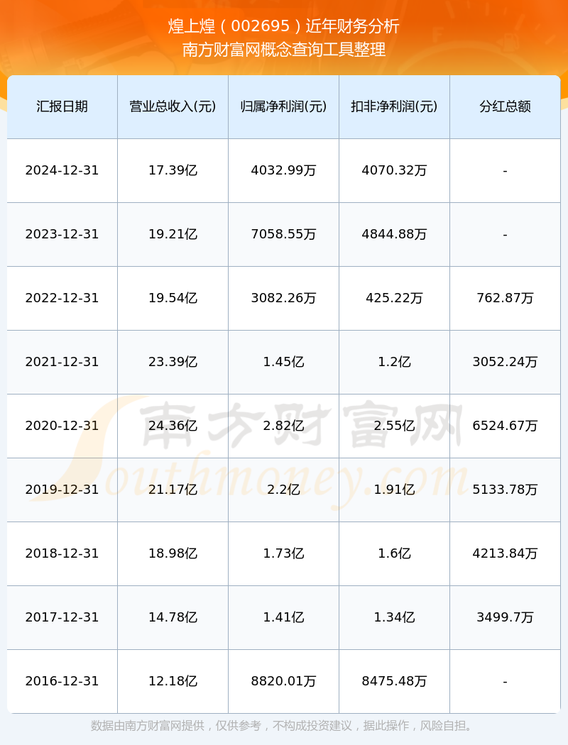 煌上煌公司2024年实现营业收入17.39亿元,同比增长-9.44%;净利润4032.99万元,同比增长-42.86%;毛利率32.76%。