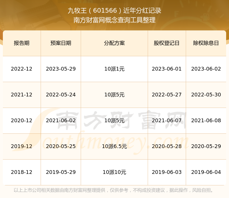 九牧王最新一次公布的分红方案为10派1元。本次权益分派股权登记日为2023年6月1日,除权除息日为2023年6月2日,派息日为2023年6月2日。