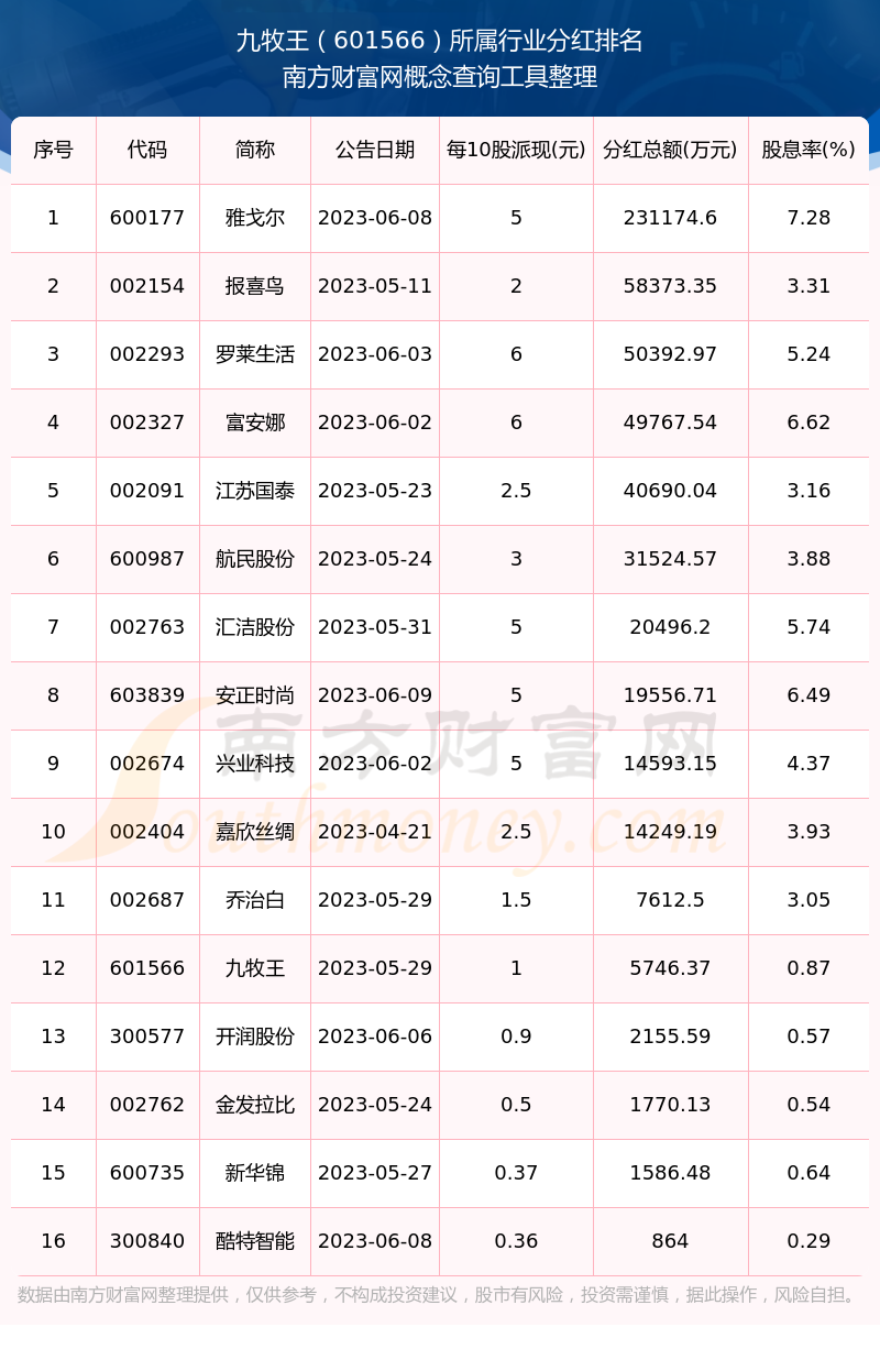 二、九牧王601566行业分红排名
