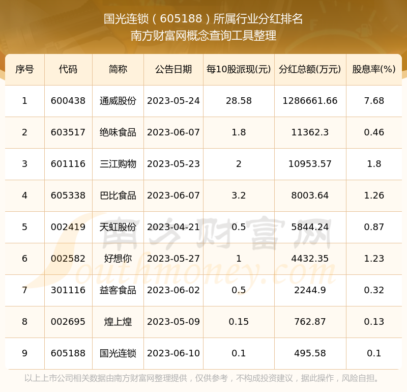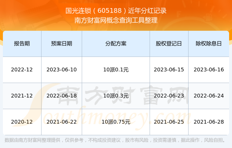 国光连锁最新一次公布的分红方案为10派0.1元。本次权益分派股权登记日为2023年6月15日,除权除息日为2023年6月16日,派息日为2023年6月16日。