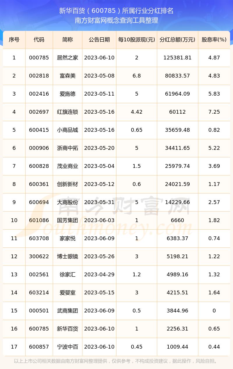 按照南方财富网趋势选股系统统计,新华百货所属行业为商业百货行业,商业百货行业分红排名情况如下表: