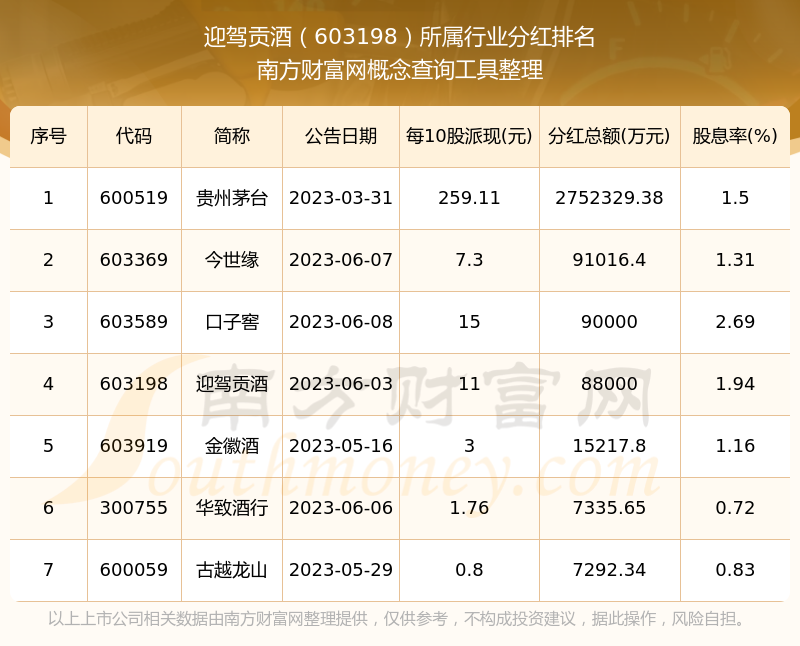 按照南方财富网趋势选股系统统计,迎驾贡酒所属行业为酿酒行业行业,酿酒行业行业分红排名情况如下表: