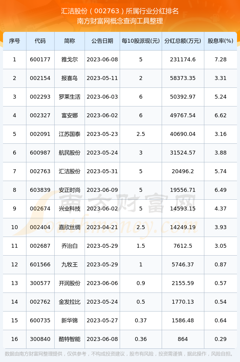 按照南方财富网趋势选股系统统计,汇洁股份所属行业为纺织服装行业,纺织服装行业分红排名情况如下表: