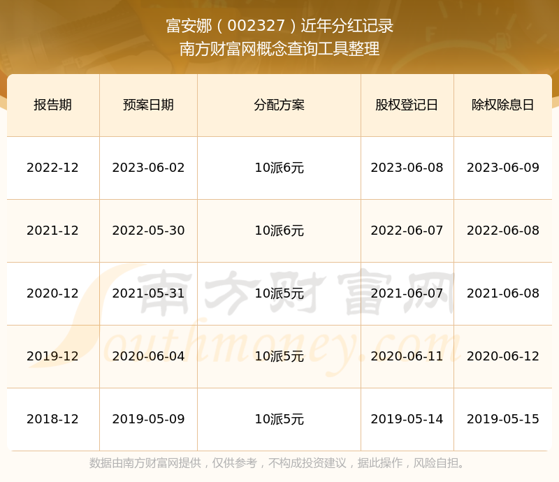富安娜最新一次公布的分红方案为10派6元。本次权益分派股权登记日为2023年6月8日,除权除息日为2023年6月9日,派息日为2023年6月9日。