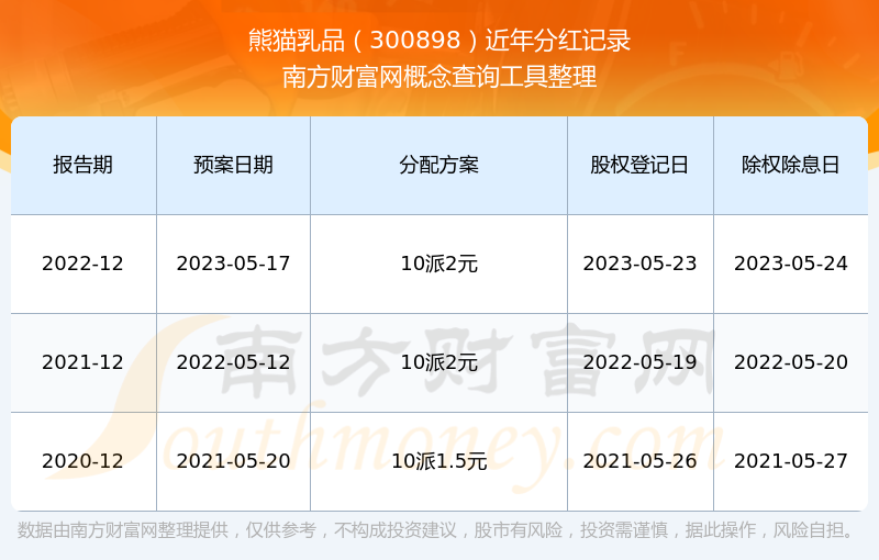 熊猫乳品最新一次公布的分红方案为10派2元。本次权益分派股权登记日为2023年5月23日,除权除息日为2023年5月24日,派息日为2023年5月24日。