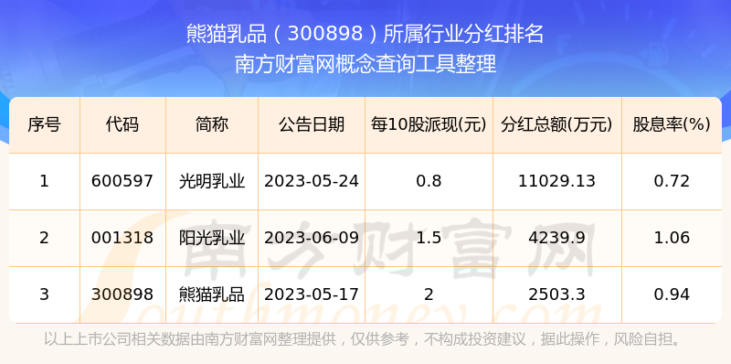 按照南方财富网趋势选股系统统计,熊猫乳品所属行业为乳制品行业,乳制品行业分红排名情况如下表: